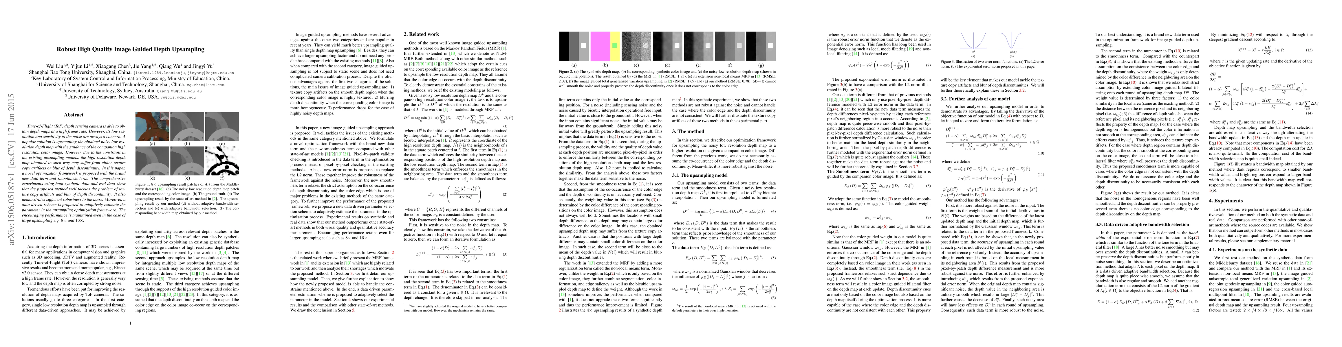 This paper proposes a novel optimization framework for upsampling low-resolution, noisy depth maps from Time-of-Flight cameras using high-resolution color images, effectively reducing texture artifacts and depth discontinuity blur while maintaining robustness to noise. The adaptive parameter estimation further enhances performance even for large upsampling factors.