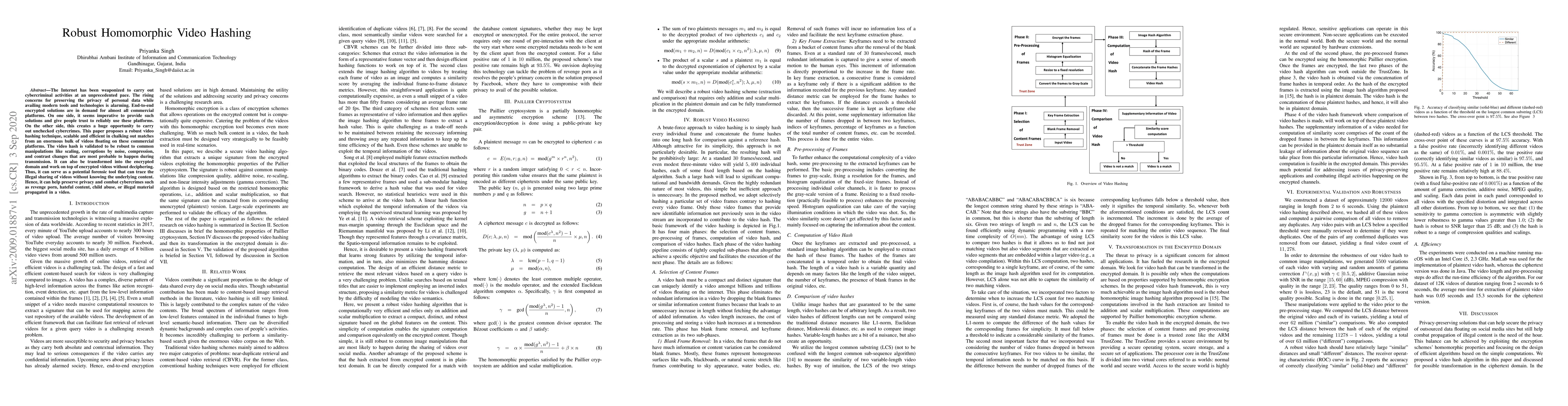 The Internet has been weaponized to carry out cybercriminal activities at an unprecedented pace. The rising concerns for preserving the privacy of personal data while availing modern tools and technologies is alarming. End-to-end encrypted solutions are in demand for almost all commercial platforms. On one side, it seems imperative to provide such solutions and give people trust to reliably use these platforms. On the other side, this creates a huge opportunity to carry out unchecked cybercrimes. This paper proposes a robust video hashing technique, scalable and efficient in chalking out matches from an enormous bulk of videos floating on these commercial platforms. The video hash is validated to be robust to common manipulations like scaling, corruptions by noise, compression, and contrast changes that are most probable to happen during transmission. It can also be transformed into the encrypted domain and work on top of encrypted videos without deciphering. Thus, it can serve as a potential forensic tool that can trace the illegal sharing of videos without knowing the underlying content. Hence, it can help preserve privacy and combat cybercrimes such as revenge porn, hateful content, child abuse, or illegal material propagated in a video.