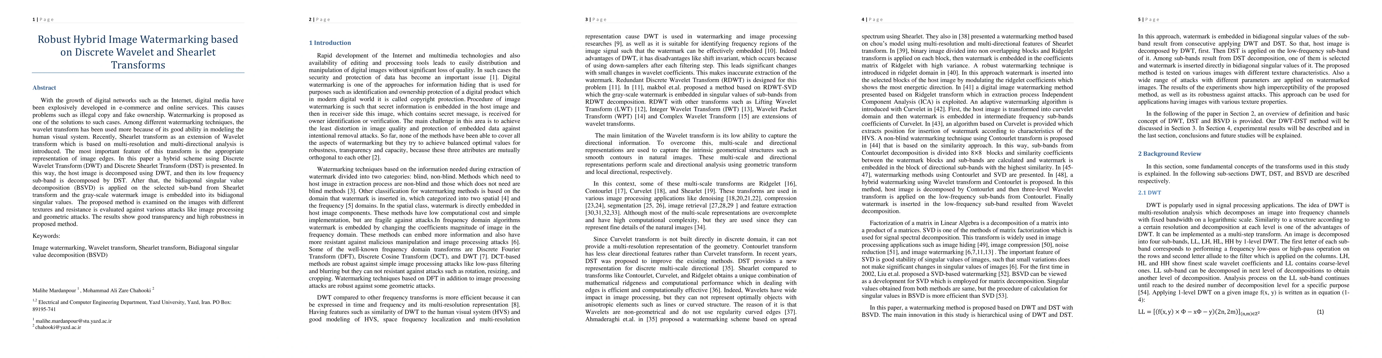This paper proposes a robust hybrid image watermarking method combining Discrete Wavelet Transform (DWT) and Discrete Shearlet Transform (DST). It embeds a gray-scale watermark into bidiagonal singular values derived from the Shearlet sub-band of a DWT-decomposed host image, demonstrating high robustness and good transparency against various attacks.
