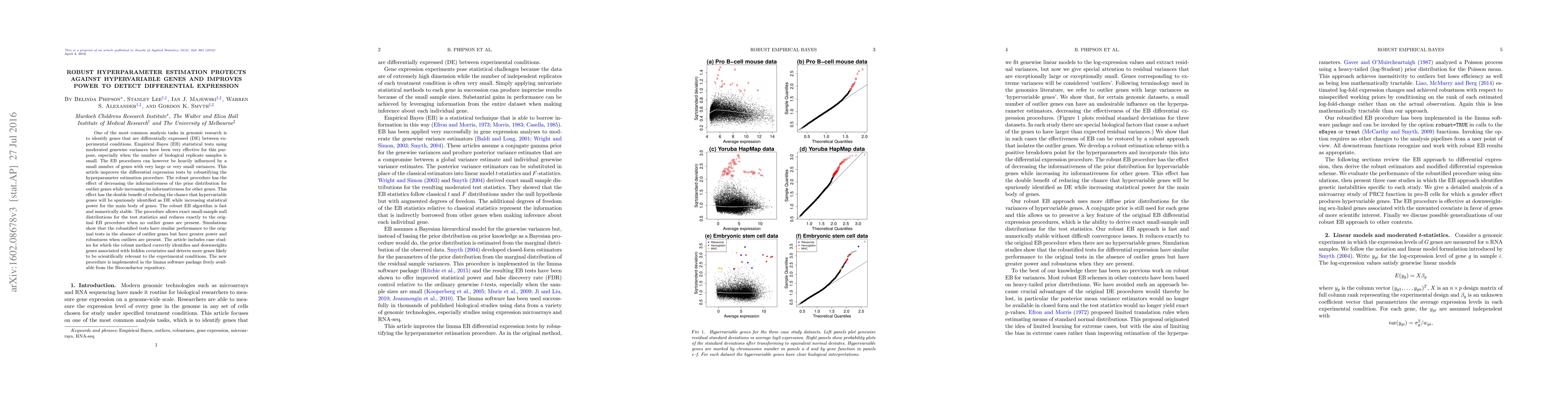 One of the most common analysis tasks in genomic research is to identify genes that are differentially expressed (DE) between experimental conditions. Empirical Bayes (EB) statistical tests using moderated genewise variances have been very effective for this purpose, especially when the number of biological replicate samples is small. The EB procedures can however be heavily influenced by a small number of genes with very large or very small variances. This article improves the differential expression tests by robustifying the hyperparameter estimation procedure. The robust procedure has the effect of decreasing the informativeness of the prior distribution for outlier genes while increasing its informativeness for other genes. This effect has the double benefit of reducing the chance that hypervariable genes will be spuriously identified as DE while increasing statistical power for the main body of genes. The robust EB algorithm is fast and numerically stable. The procedure allows exact small-sample null distributions for the test statistics and reduces exactly to the original EB procedure when no outlier genes are present. Simulations show that the robustified tests have similar performance to the original tests in the absence of outlier genes but have greater power and robustness when outliers are present. The article includes case studies for which the robust method correctly identifies and downweights genes associated with hidden covariates and detects more genes likely to be scientifically relevant to the experimental conditions. The new procedure is implemented in the limma software package freely available from the Bioconductor repository.
