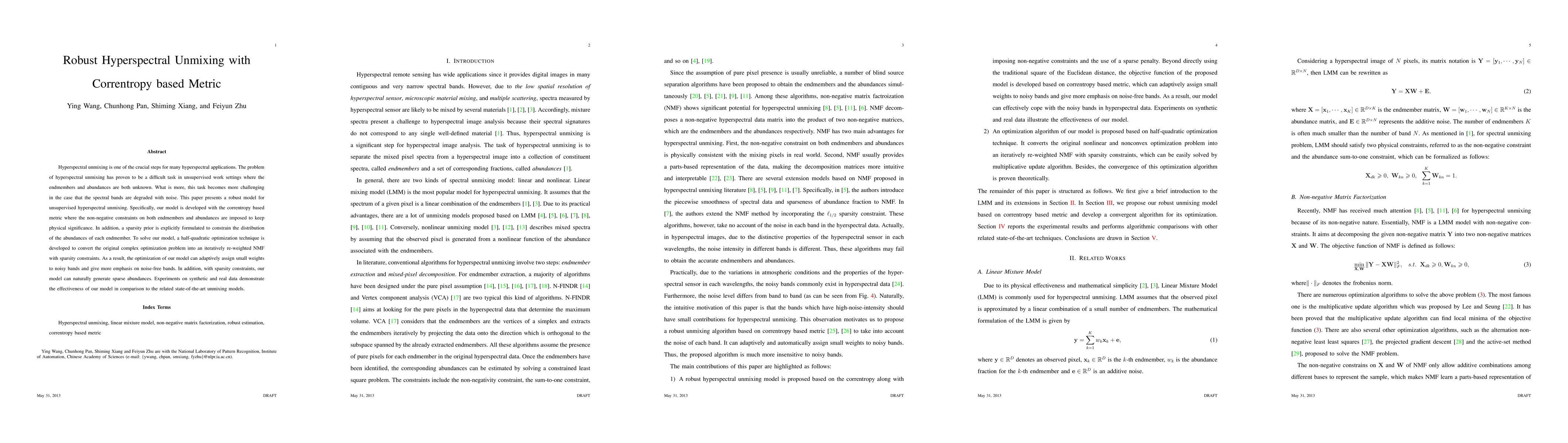 This paper proposes a robust unsupervised hyperspectral unmixing model using a correntropy-based metric to handle noise and unknown endmembers. The model incorporates non-negative constraints and a sparsity prior to emphasize noise-free bands and generate sparse abundances, solved via a half-quadratic optimization technique. Experimental results show its effectiveness over state-of-the-art methods.