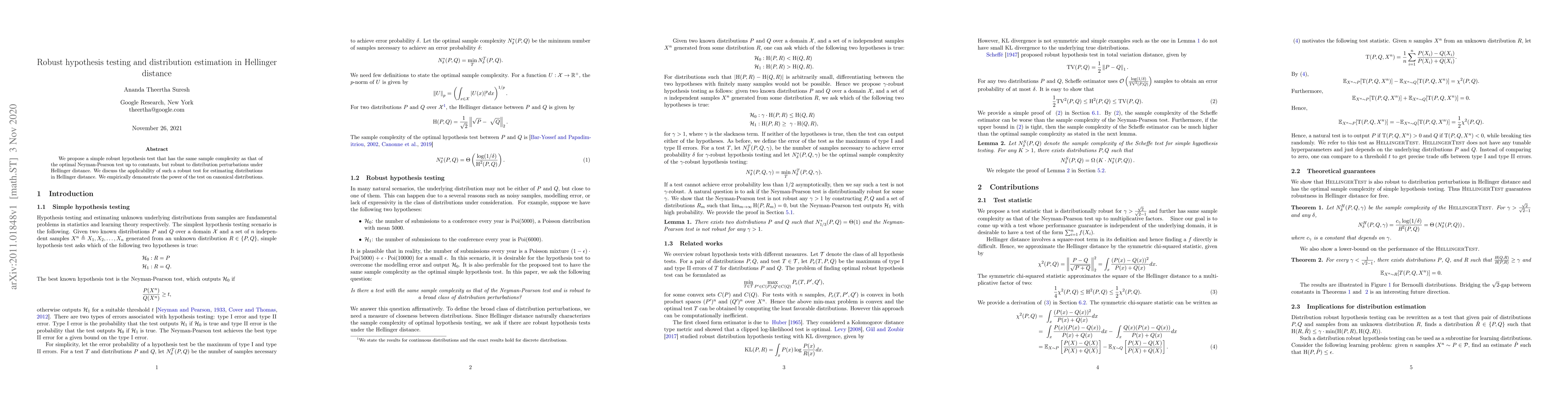 We propose a simple robust hypothesis test that has the same sample complexity as that of the optimal Neyman-Pearson test up to constants, but robust to distribution perturbations under Hellinger distance. We discuss the applicability of such a robust test for estimating distributions in Hellinger distance. We empirically demonstrate the power of the test on canonical distributions.
