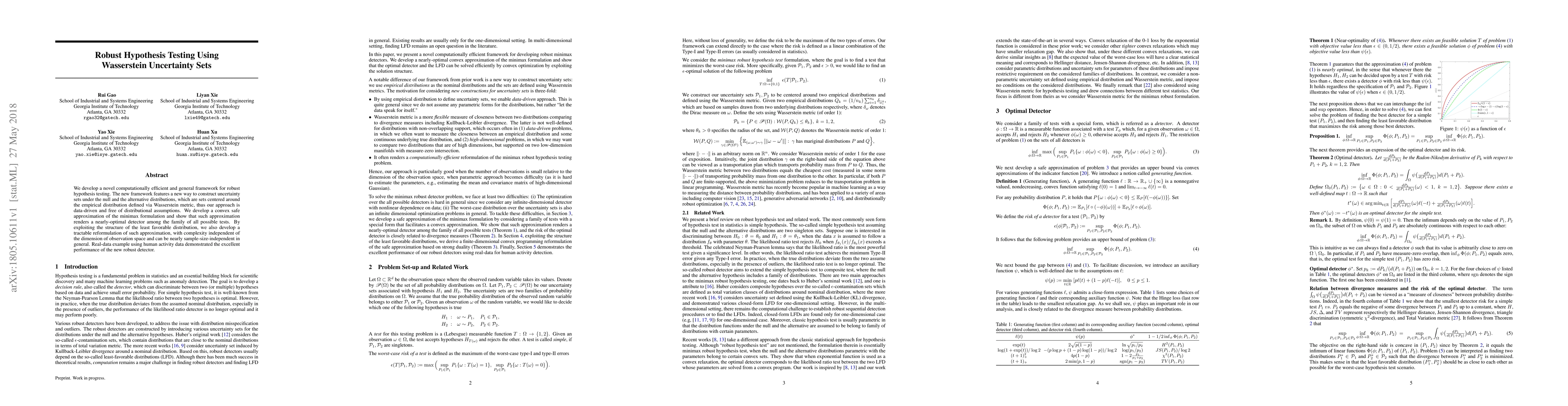This paper introduces a novel framework for robust hypothesis testing that constructs uncertainty sets using Wasserstein metrics, eliminating distributional assumptions. The proposed method provides a nearly-optimal detector with a tractable reformulation, demonstrating excellent performance on human activity data.