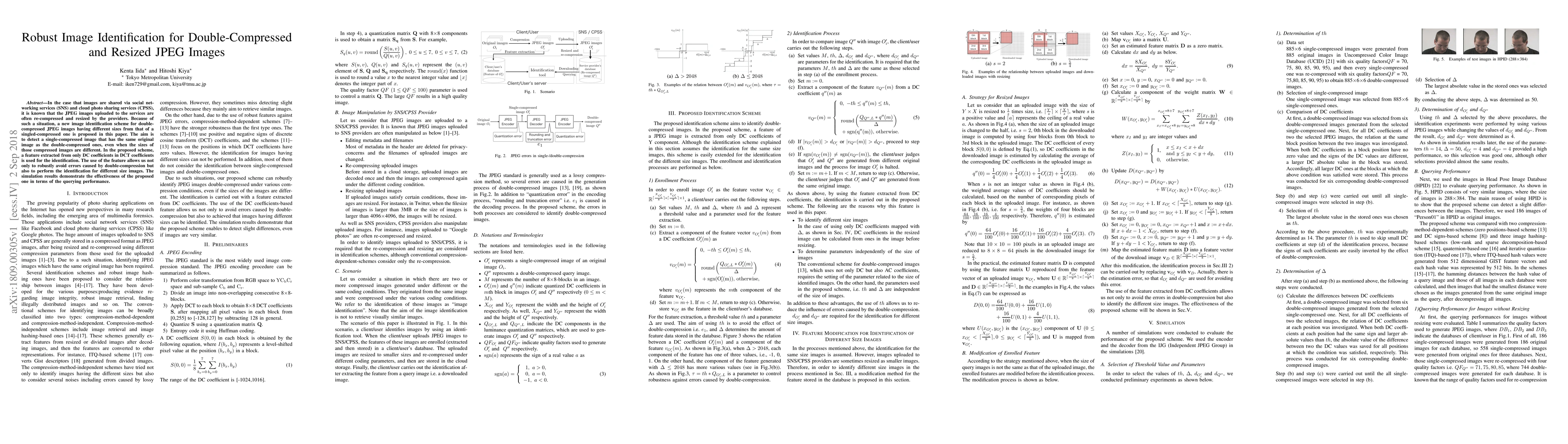 This paper proposes an image identification scheme for double-compressed and resized JPEG images, using features extracted from DC coefficients in DCT coefficients. The method aims to detect single-compressed images that share the same original image, despite differing sizes, demonstrating effectiveness in querying performance.