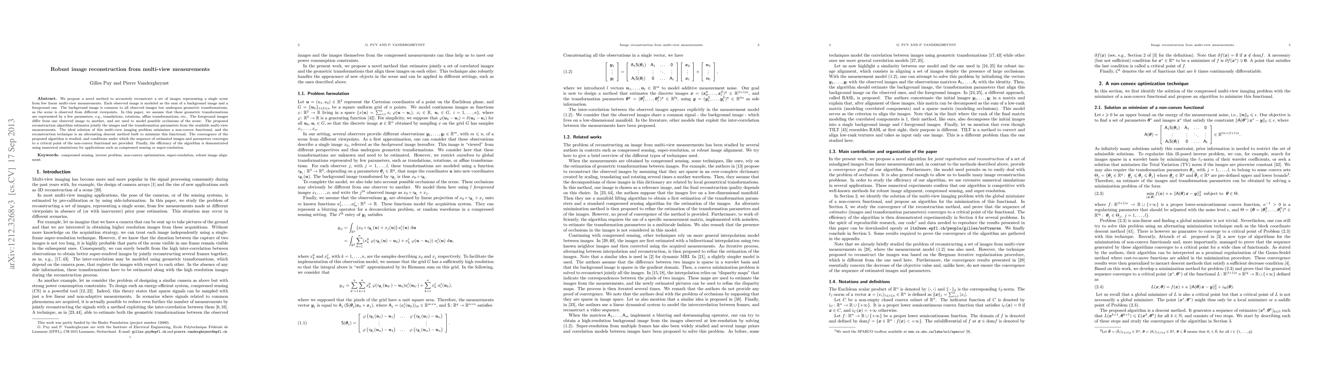This paper proposes a novel method for reconstructing images from sparse multi-view measurements, modeling each image as a combination of a common background and a viewpoint-specific foreground. The algorithm jointly estimates images and transformation parameters, minimizing a non-convex functional through an alternating descent method, with convergence conditions and demonstrated efficiency in applications like compressed sensing and super-resolution.