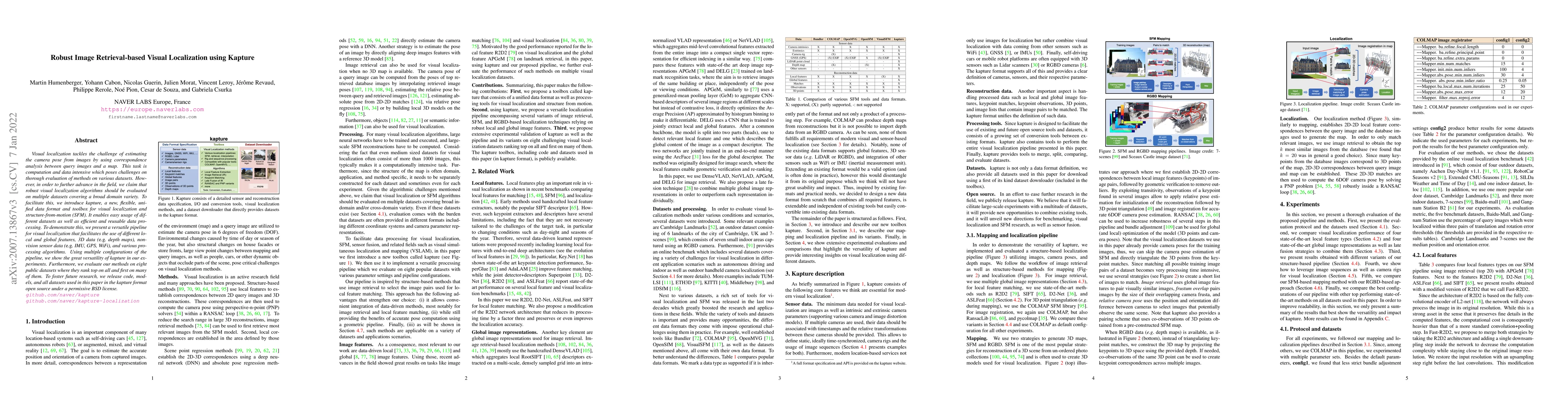 This paper introduces Kapture, a unified data format and toolbox for visual localization and structure-from-motion, aimed at facilitating robust evaluation across diverse datasets. The authors demonstrate its versatility through a comprehensive pipeline and achieve top rankings on multiple public datasets, releasing all resources to promote future research.