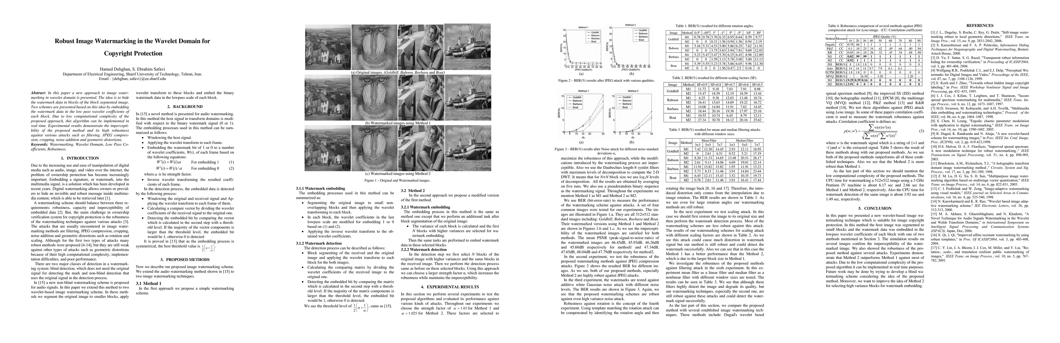 This paper introduces a novel wavelet domain image watermarking technique that embeds watermarks in low pass wavelet coefficients of segmented image blocks, ensuring low computational complexity and real-time implementation. The method demonstrates high robustness against various attacks while maintaining imperceptibility.