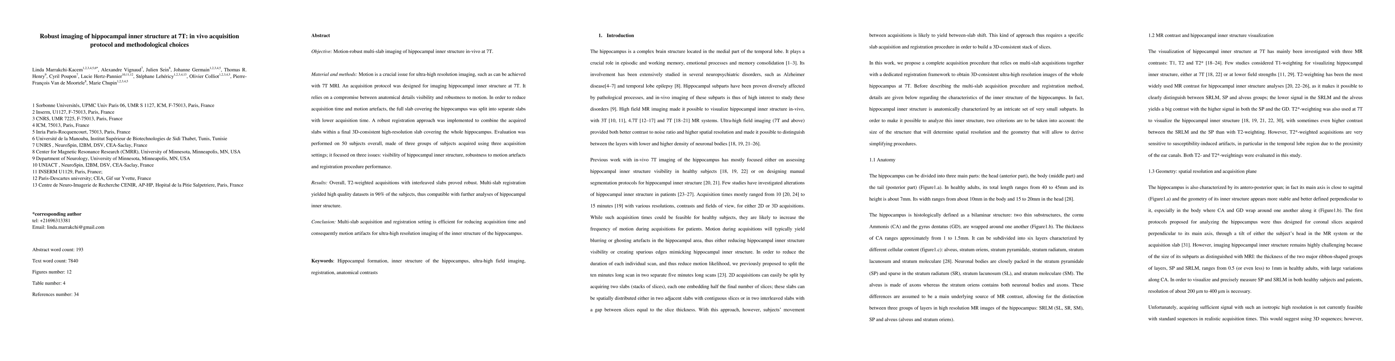 OBJECTIVE:Motion-robust multi-slab imaging of hippocampal inner structure in vivo at 7T.MATERIALS AND METHODS:Motion is a crucial issue for ultra-high resolution imaging, such as can be achieved with 7T MRI. An acquisition protocol was designed for imaging hippocampal inner structure at 7T. It relies on a compromise between anatomical details visibility and robustness to motion. In order to reduce acquisition time and motion artifacts, the full slab covering the hippocampus was split into separate slabs with lower acquisition time. A robust registration approach was implemented to combine the acquired slabs within a final 3D-consistent high-resolution slab covering the whole hippocampus. Evaluation was performed on 50 subjects overall, made of three groups of subjects acquired using three acquisition settings; it focused on three issues: visibility of hippocampal inner structure, robustness to motion artifacts and registration procedure performance.RESULTS:Overall, T2-weighted acquisitions with interleaved slabs proved robust. Multi-slab registration yielded high quality datasets in 96 % of the subjects, thus compatible with further analyses of hippocampal inner structure.CONCLUSION:Multi-slab acquisition and registration setting is efficient for reducing acquisition time and consequently motion artifacts for ultra-high resolution imaging of the inner structure of the hippocampus.