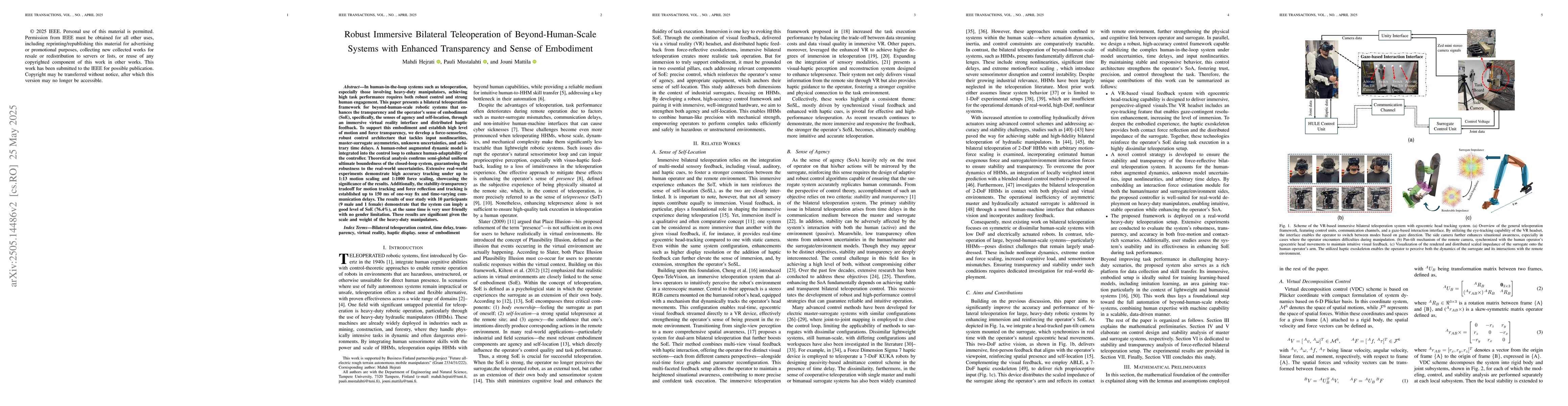 The paper presents a bilateral teleoperation framework for beyond-human-scale robotic systems, employing an immersive virtual reality interface and distributed haptic feedback to enhance transparency and operator's sense of embodiment (SoE). A force-sensorless, robust control architecture is developed to handle input nonlinearities, asymmetries, uncertainties, and time delays, with a human-robot augmented dynamic model integrated into the control loop for human-adaptability.