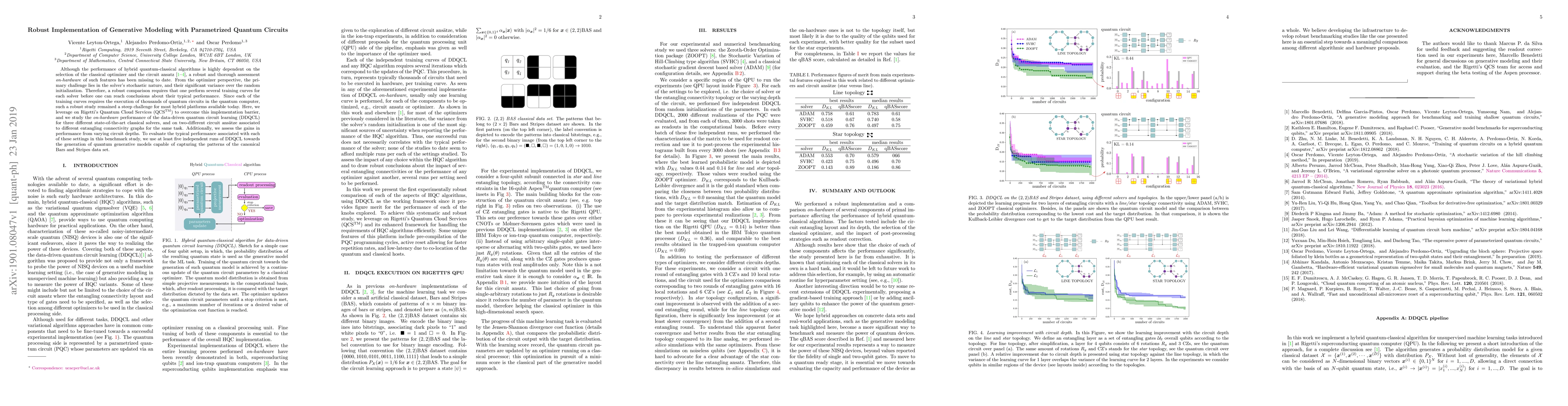 Although the performance of hybrid quantum-classical algorithms is highly dependent on the selection of the classical optimizer and the circuit ansatz, a robust and thorough assessment on-hardware of such features has been missing to date. From the optimizer perspective, the primary challenge lies in the solver's stochastic nature, and their significant variance over the random initialization. Therefore, a robust comparison requires that one perform several training curves for each solver before one can reach conclusions about their typical performance. Since each of the training curves requires the execution of thousands of quantum circuits in the quantum computer, such a robust study remained a steep challenge for most hybrid platforms available today. Here, we leverage on Rigetti's Quantum Cloud Services to overcome this implementation barrier, and we study the on-hardware performance of the data-driven quantum circuit learning (DDQCL) for three different state-of-the-art classical solvers, and on two-different circuit ansatze associated to different entangling connectivity graphs for the same task. Additionally, we assess the gains in performance from varying circuit depths. To evaluate the typical performance associated with each of these settings in this benchmark study, we use at least five independent runs of DDQCL towards the generation of quantum generative models capable of capturing the patterns of the canonical Bars and Stripes data set.