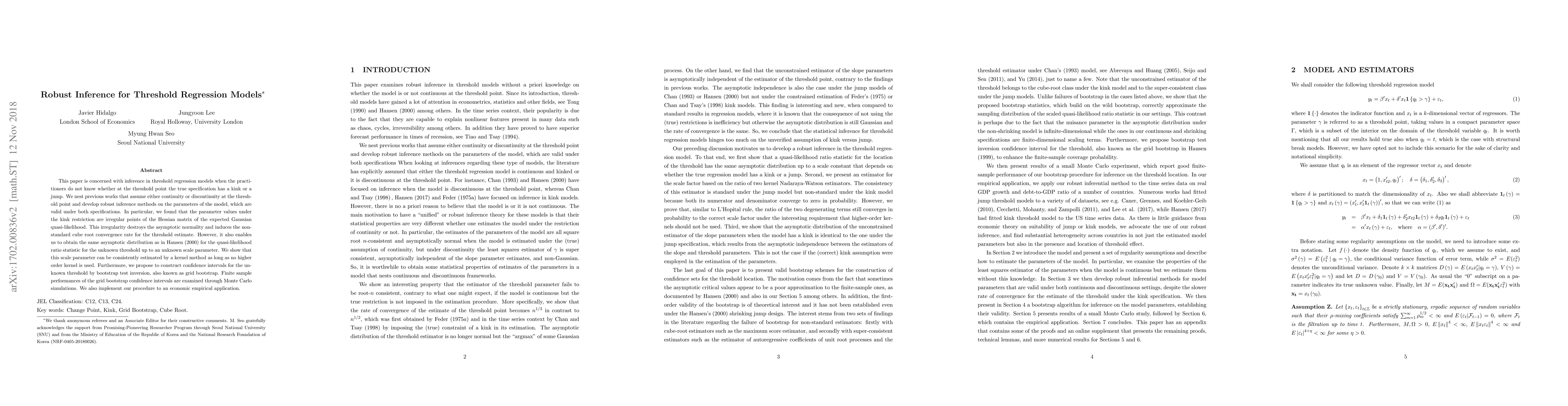 This paper develops robust inference methods for threshold regression models, accounting for both kink and jump assumptions at the threshold point. It provides a new approach to estimating confidence intervals using grid bootstrap and demonstrates its validity through an economic empirical application.