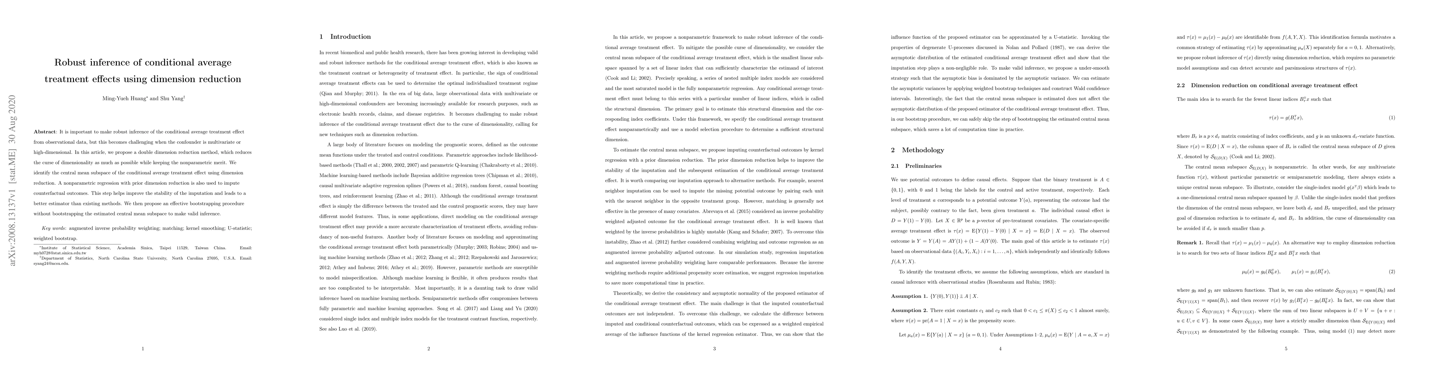 This paper proposes a double dimension reduction method to robustly infer conditional average treatment effects from high-dimensional observational data. It identifies the central mean subspace and uses nonparametric regression to improve the stability of counterfactual outcome imputation, leading to a more effective estimator than existing methods.