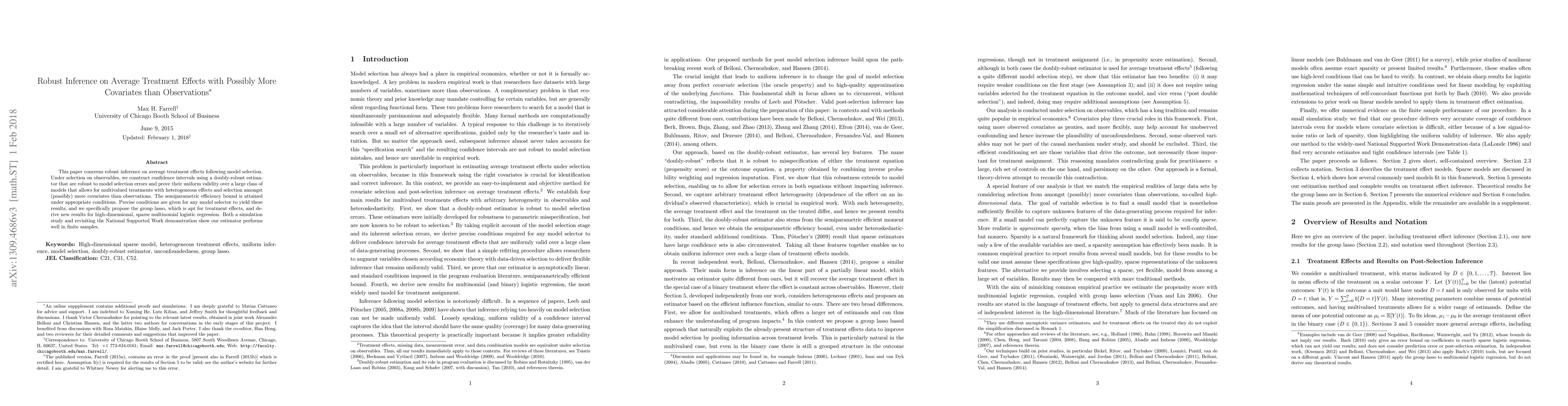 This paper concerns robust inference on average treatment effects following model selection. In the selection on observables framework, we show how to construct confidence intervals based on a doubly-robust estimator that are robust to model selection errors and prove that they are valid uniformly over a large class of treatment effect models. The class allows for multivalued treatments with heterogeneous effects (in observables), general heteroskedasticity, and selection amongst (possibly) more covariates than observations. Our estimator attains the semiparametric efficiency bound under appropriate conditions. Precise conditions are given for any model selector to yield these results, and we show how to combine data-driven selection with economic theory. For implementation, we give a specific proposal for selection based on the group lasso, which is particularly well-suited to treatment effects data, and derive new results for high-dimensional, sparse multinomial logistic regression. A simulation study shows our estimator performs very well in finite samples over a wide range of models. Revisiting the National Supported Work demonstration data, our method yields accurate estimates and tight confidence intervals.