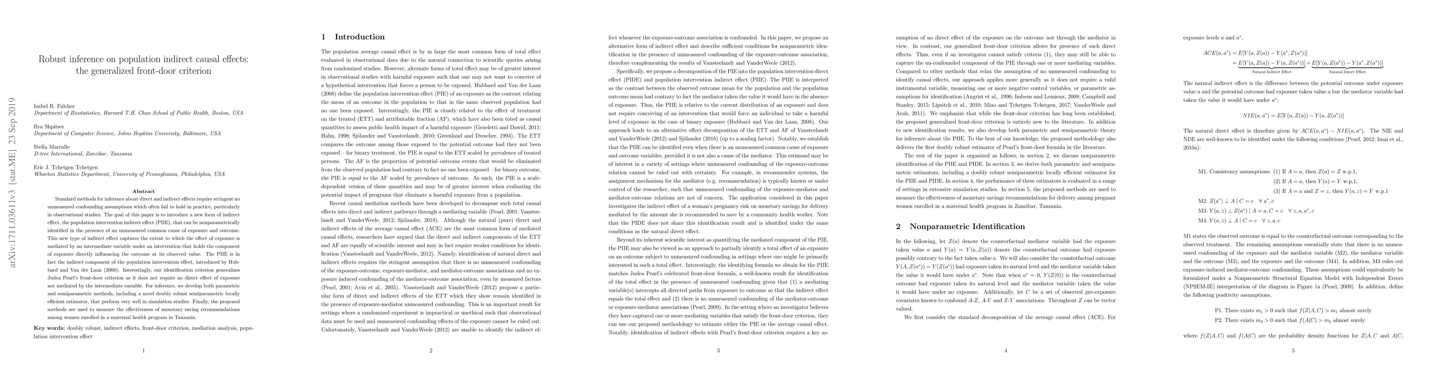 Standard methods for inference about direct and indirect effects require stringent no unmeasured confounding assumptions which often fail to hold in practice, particularly in observational studies. The goal of this paper is to introduce a new form of indirect effect, the population intervention indirect effect (PIIE), that can be nonparametrically identified in the presence of an unmeasured common cause of exposure and outcome. This new type of indirect effect captures the extent to which the effect of exposure is mediated by an intermediate variable under an intervention that holds the component of exposure directly influencing the outcome at its observed value. The PIIE is in fact the indirect component of the population intervention effect, introduced by Hubbard and Van der Laan (2008). Interestingly, our identification criterion generalizes Judea Pearl's front-door criterion as it does not require no direct effect of exposure not mediated by the intermediate variable. For inference, we develop both parametric and semiparametric methods, including a novel doubly robust semiparametric locally efficient estimator, that perform very well in simulation studies. Finally, the proposed methods are used to measure the effectiveness of monetary saving recommendations among women enrolled in a maternal health program in Tanzania.