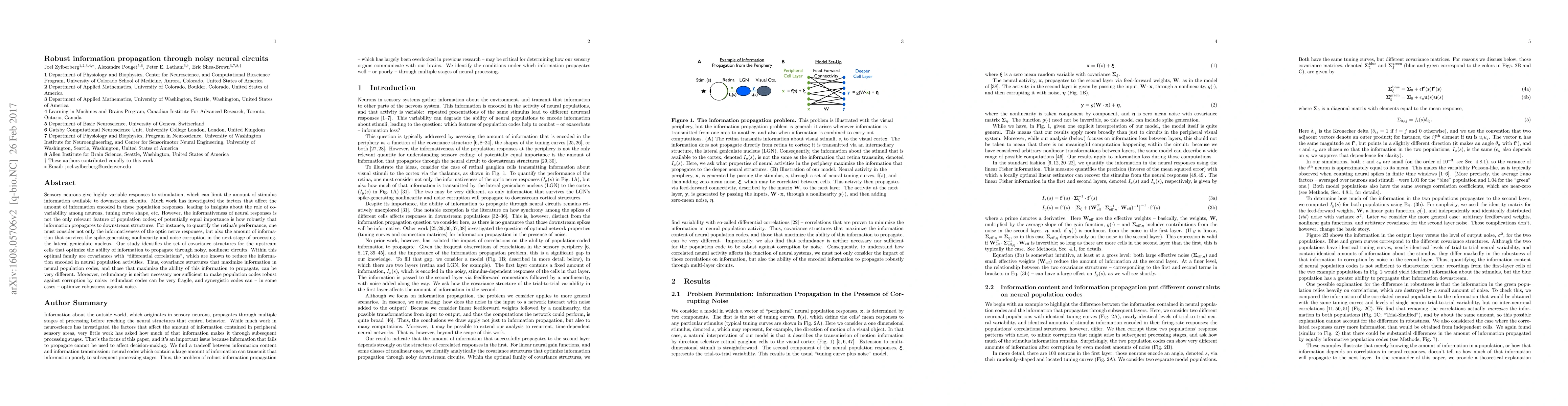 Sensory neurons give highly variable responses to stimulation, which can limit the amount of stimulus information available to downstream circuits. Much work has investigated the factors that affect the amount of information encoded in these population responses, leading to insights about the role of covariability among neurons, tuning curve shape, etc. However, the informativeness of neural responses is not the only relevant feature of population codes; of potentially equal importance is how robustly that information propagates to downstream structures. For instance, to quantify the retina's performance, one must consider not only the informativeness of the optic nerve responses, but also the amount of information that survives the spike-generating nonlinearity and noise corruption in the next stage of processing, the lateral geniculate nucleus. Our study identifies the set of covariance structures for the upstream cells that optimize the ability of information to propagate through noisy, nonlinear circuits. Within this optimal family are covariances with "differential correlations", which are known to reduce the information encoded in neural population activities. Thus, covariance structures that maximize information in neural population codes, and those that maximize the ability of this information to propagate, can be very different.