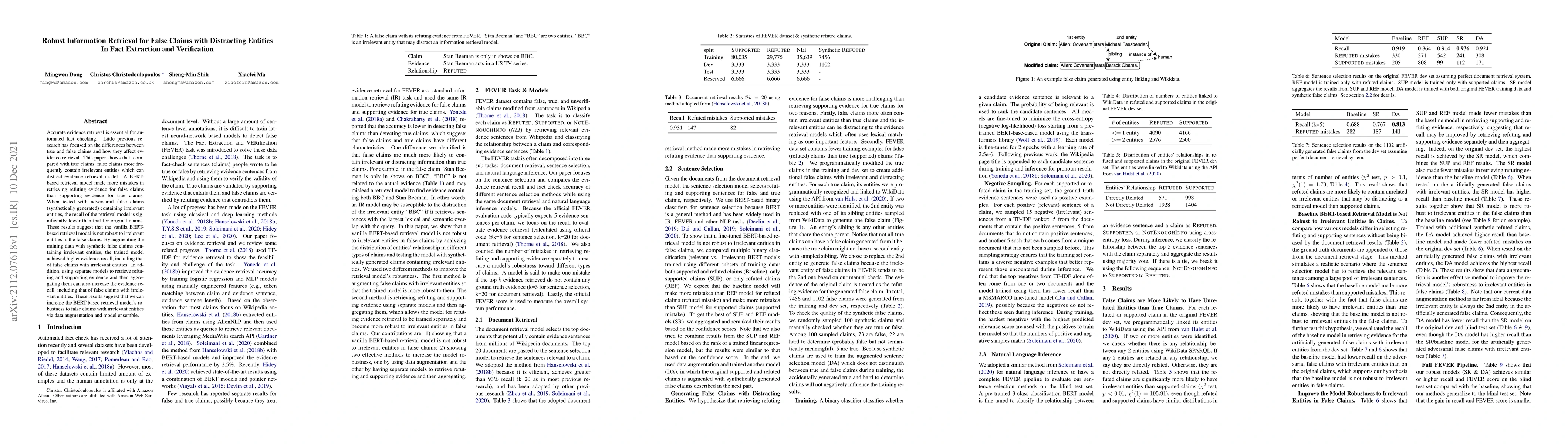 This paper investigates the challenges in evidence retrieval for false claims, particularly those with distracting irrelevant entities. It finds that a BERT-based model struggles more with false claims, achieving lower recall. The study proposes solutions, including data augmentation and model ensemble techniques, to improve the model's robustness and evidence retrieval accuracy for false claims.
