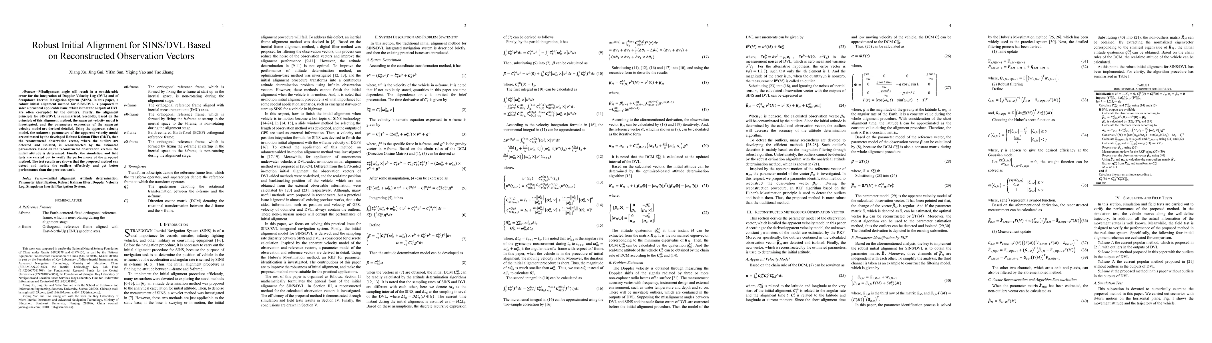 Misalignment angle will result in a considerable error for the integration of Doppler Velocity Log (DVL) and of Strapdown Inertial Navigation System (SINS). In this paper, a robust initial alignment method for SINS/DVL is proposed to solve a practical applicable issue, which is that the outputs of DVL are often corrupted by the outliers. Firstly, the alignment principle for SINS/DVL is summarized. Secondly, based on the principle of this alignment method, the apparent velocity model is investigated, and the parameters expression of the apparent velocity model are derived detailed. Using the apparent velocity model, the unknown parameters of the apparent velocity model are estimated by the developed Robust Kalman Filter (RKF), then the reconstructed observation vector, where the outliers are detected and isolated, is reconstructed by the estimated parameters. Based on the reconstructed observation vectors, the initial attitude is determined. Finally, the simulation and field tests are carried out to verify the performance of the proposed method. The test results are shown that the proposed method can detect and isolate the outliers effectively and get better performance than the previous work.