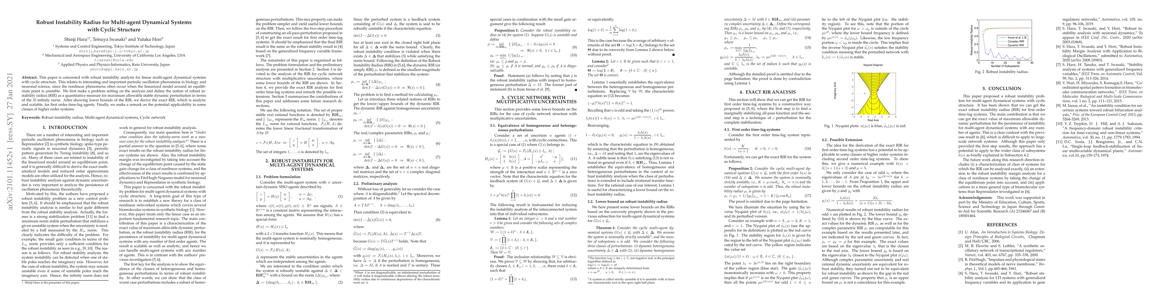 This paper analyzes robust instability in linear multi-agent systems with cyclic structure, introducing the robust instability radius (RIR) as a measure of maximum stable dynamic perturbation. The exact RIR is derived for first-order time-lag agents, with potential applications to higher-order systems.