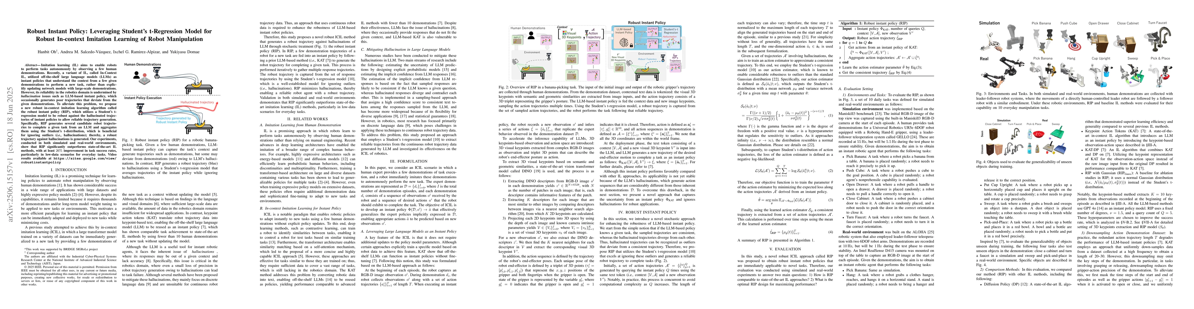 Imitation learning (IL) aims to enable robots to perform tasks autonomously by observing a few human demonstrations. Recently, a variant of IL, called In-Context IL, utilized off-the-shelf large language models (LLMs) as instant policies that understand the context from a few given demonstrations to perform a new task, rather than explicitly updating network models with large-scale demonstrations. However, its reliability in the robotics domain is undermined by hallucination issues such as LLM-based instant policy, which occasionally generates poor trajectories that deviate from the given demonstrations. To alleviate this problem, we propose a new robust in-context imitation learning algorithm called the robust instant policy (RIP), which utilizes a Student's t-regression model to be robust against the hallucinated trajectories of instant policies to allow reliable trajectory generation. Specifically, RIP generates several candidate robot trajectories to complete a given task from an LLM and aggregates them using the Student's t-distribution, which is beneficial for ignoring outliers (i.e., hallucinations); thereby, a robust trajectory against hallucinations is generated. Our experiments, conducted in both simulated and real-world environments, show that RIP significantly outperforms state-of-the-art IL methods, with at least $26\%$ improvement in task success rates, particularly in low-data scenarios for everyday tasks. Video results available at https://sites.google.com/view/robustinstantpolicy.