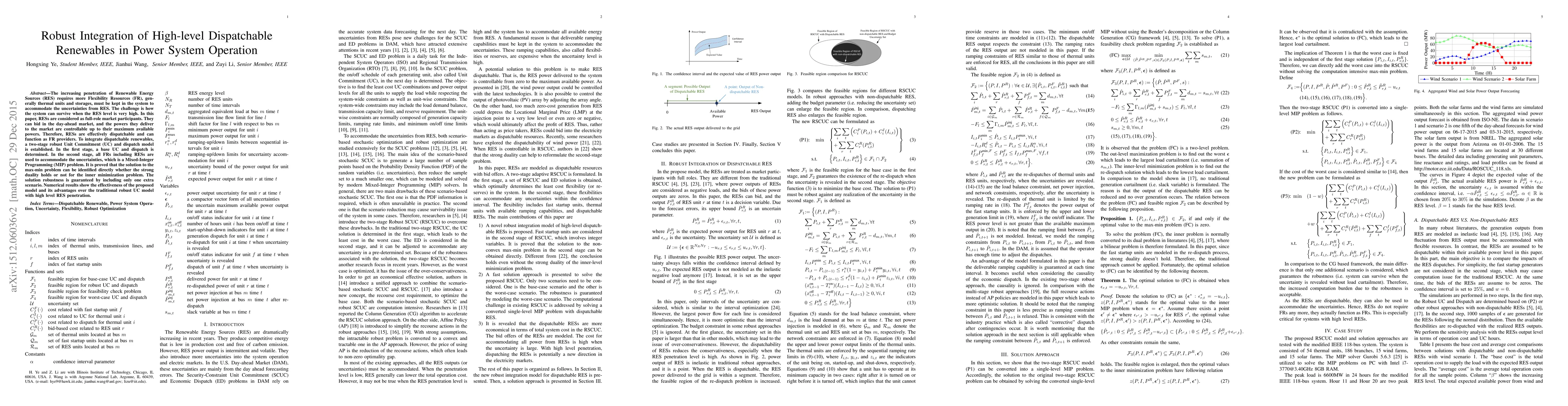 The increasing penetration of Renewable Energy Sources (RES) requires more Flexibility Resources (FR), generally thermal units and storages, must be kept in the system to accommodate the uncertainties from RES. The challenge is how the system can survive when the RES level is very high. In this paper, RESs are considered as full-role market participants. They can bid in the day-ahead market, and the powers they deliver to the market are controllable up to their maximum available powers. Therefore, RESs are effectively dispatchable and can function as FR providers. To integrate dispatchable renewables, a two-stage robust Unit Commitment (UC) and dispatch model is established. In the first stage, a base UC and dispatch is determined. In the second stage, all FRs including RESs are used to accommodate the uncertainties, which is a Mixed-Integer Programming (MIP) problem. It is proved that the solution to the max-min problem can be identified directly whether the strong duality holds or not for the inner minimization problem. The solution robustness is guaranteed by including only one extra scenario. Numerical results show the effectiveness of the proposed model and its advantages over the traditional robust UC model with high level RES penetration.