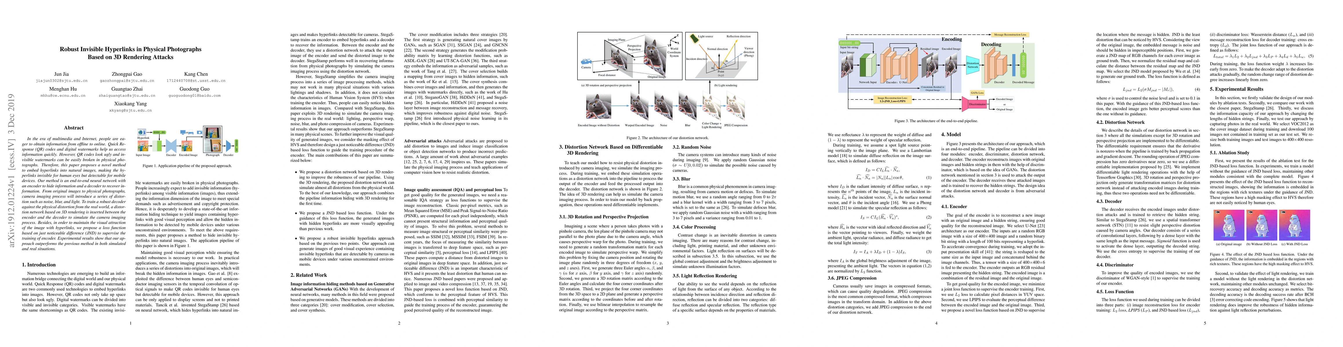 In the era of multimedia and Internet, people are eager to obtain information from offline to online. Quick Response (QR) codes and digital watermarks help us access information quickly. However, QR codes look ugly and invisible watermarks can be easily broken in physical photographs. Therefore, this paper proposes a novel method to embed hyperlinks into natural images, making the hyperlinks invisible for human eyes but detectable for mobile devices. Our method is an end-to-end neural network with an encoder to hide information and a decoder to recover information. From original images to physical photographs, camera imaging process will introduce a series of distortion such as noise, blur, and light. To train a robust decoder against the physical distortion from the real world, a distortion network based on 3D rendering is inserted between the encoder and the decoder to simulate the camera imaging process. Besides, in order to maintain the visual attraction of the image with hyperlinks, we propose a loss function based on just noticeable difference (JND) to supervise the training of encoder. Experimental results show that our approach outperforms the previous method in both simulated and real situations.