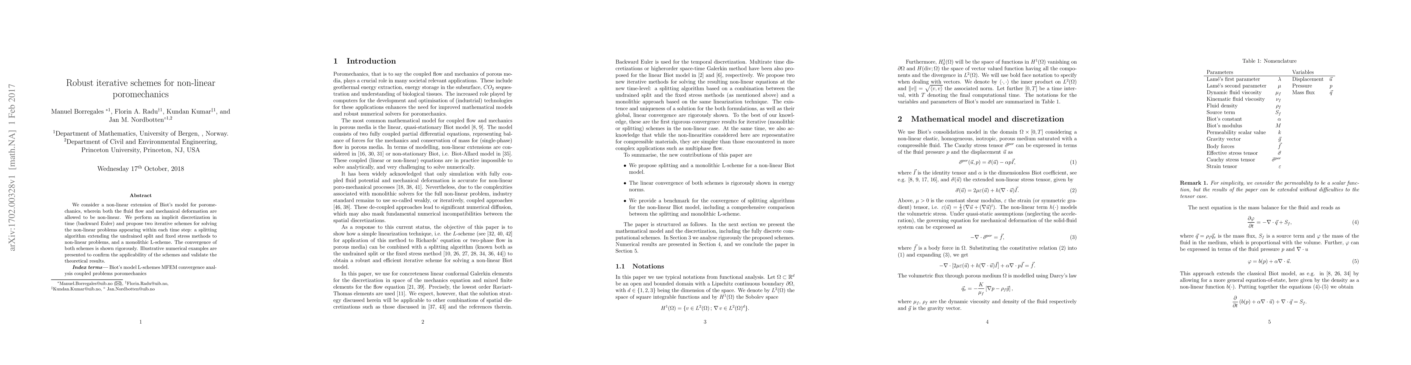 Researchers develop two robust iterative schemes for solving non-linear poromechanics problems, including a splitting algorithm and a monolithic L-scheme, with rigorous convergence proofs and numerical examples validating the results.