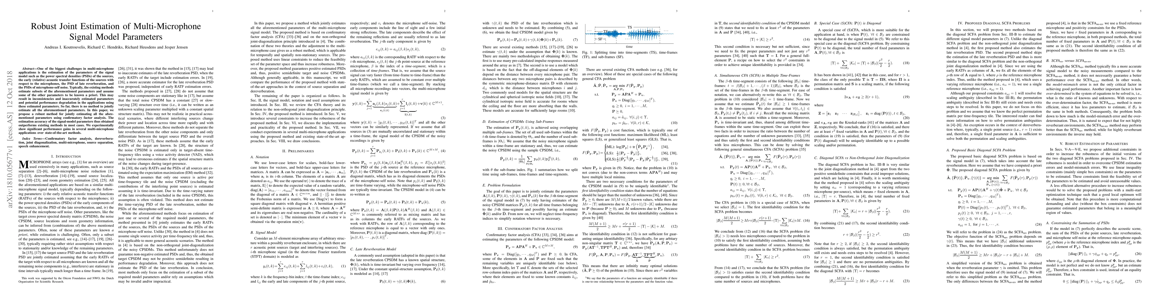 One of the biggest challenges in multi-microphone applications is the estimation of the parameters of the signal model such as the power spectral densities (PSDs) of the sources, the early (relative) acoustic transfer functions of the sources with respect to the microphones, the PSD of late reverberation, and the PSDs of microphone-self noise. Typically, the existing methods estimate subsets of the aforementioned parameters and assume some of the other parameters to be known a priori. This may result in inconsistencies and inaccurately estimated parameters and potential performance degradation in the applications using these estimated parameters. So far, there is no method to jointly estimate all the aforementioned parameters. In this paper, we propose a robust method for jointly estimating all the aforementioned parameters using confirmatory factor analysis. The estimation accuracy of the signal-model parameters thus obtained outperforms existing methods in most cases. We experimentally show significant performance gains in several multi-microphone applications over state-of-the-art methods.