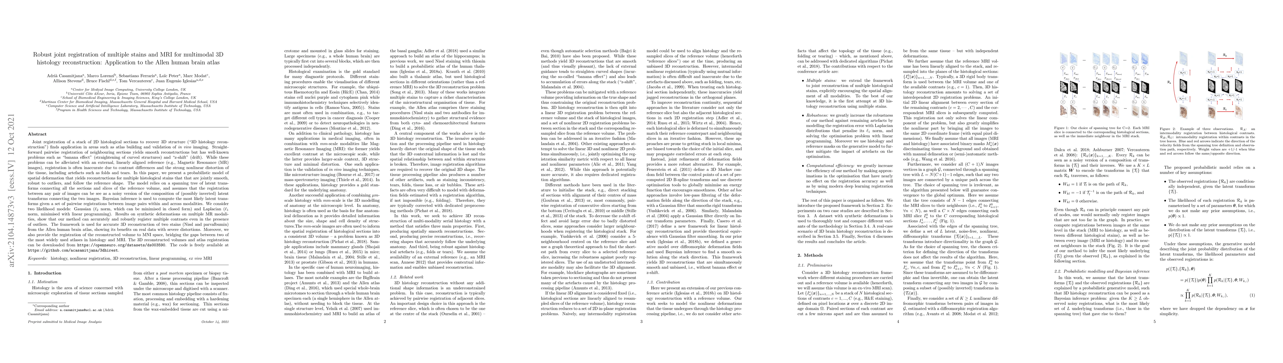 This paper presents a robust probabilistic model for joint registration of multiple histological stains and MRI to achieve accurate 3D histology reconstruction, addressing issues like "banana effect" and "z-shift." The model uses latent transforms and Bayesian inference to handle nonlinear distortions and artifacts, demonstrated through the Allen human brain atlas and registration to MNI space.