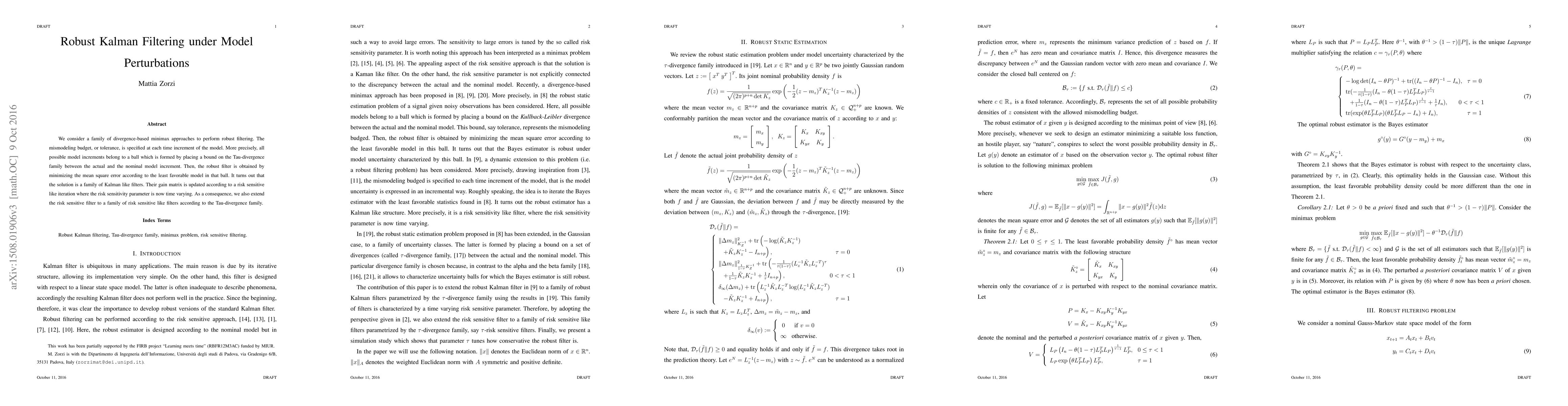 We consider a family of divergence-based minimax approaches to perform robust filtering. The mismodeling budget, or tolerance, is specified at each time increment of the model. More precisely, all possible model increments belong to a ball which is formed by placing a bound on the Tau-divergence family between the actual and the nominal model increment. Then, the robust filter is obtained by minimizing the mean square error according to the least favorable model in that ball. It turns out that the solution is a family of Kalman like filters. Their gain matrix is updated according to a risk sensitive like iteration where the risk sensitivity parameter is now time varying. As a consequence, we also extend the risk sensitive filter to a family of risk sensitive like filters according to the Tau-divergence family.