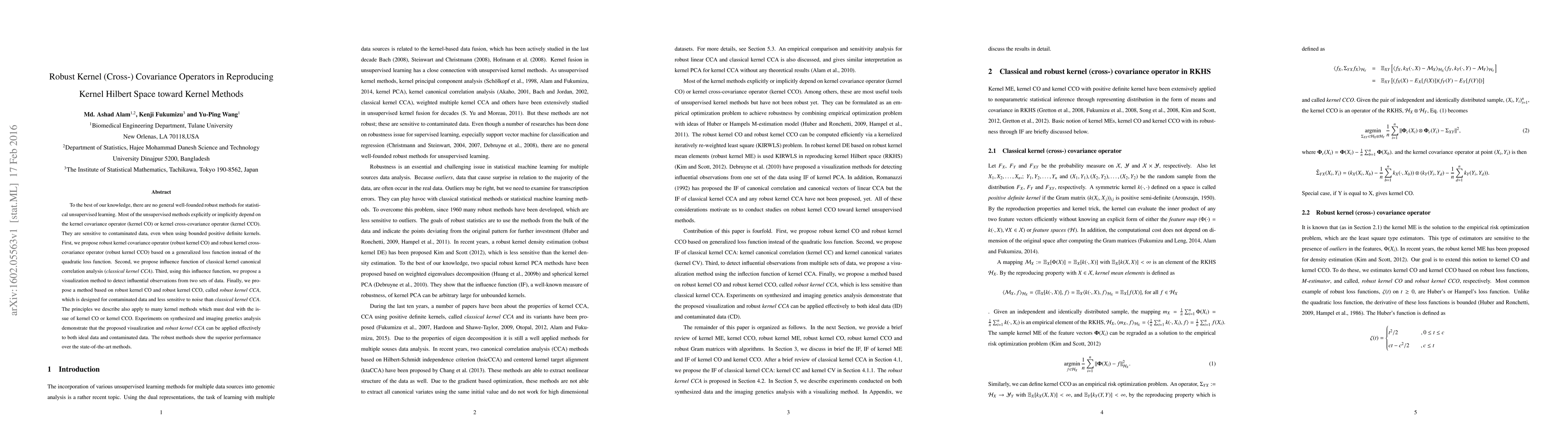 To the best of our knowledge, there are no general well-founded robust methods for statistical unsupervised learning. Most of the unsupervised methods explicitly or implicitly depend on the kernel covariance operator (kernel CO) or kernel cross-covariance operator (kernel CCO). They are sensitive to contaminated data, even when using bounded positive definite kernels. First, we propose robust kernel covariance operator (robust kernel CO) and robust kernel crosscovariance operator (robust kernel CCO) based on a generalized loss function instead of the quadratic loss function. Second, we propose influence function of classical kernel canonical correlation analysis (classical kernel CCA). Third, using this influence function, we propose a visualization method to detect influential observations from two sets of data. Finally, we propose a method based on robust kernel CO and robust kernel CCO, called robust kernel CCA, which is designed for contaminated data and less sensitive to noise than classical kernel CCA. The principles we describe also apply to many kernel methods which must deal with the issue of kernel CO or kernel CCO. Experiments on synthesized and imaging genetics analysis demonstrate that the proposed visualization and robust kernel CCA can be applied effectively to both ideal data and contaminated data. The robust methods show the superior performance over the state-of-the-art methods.