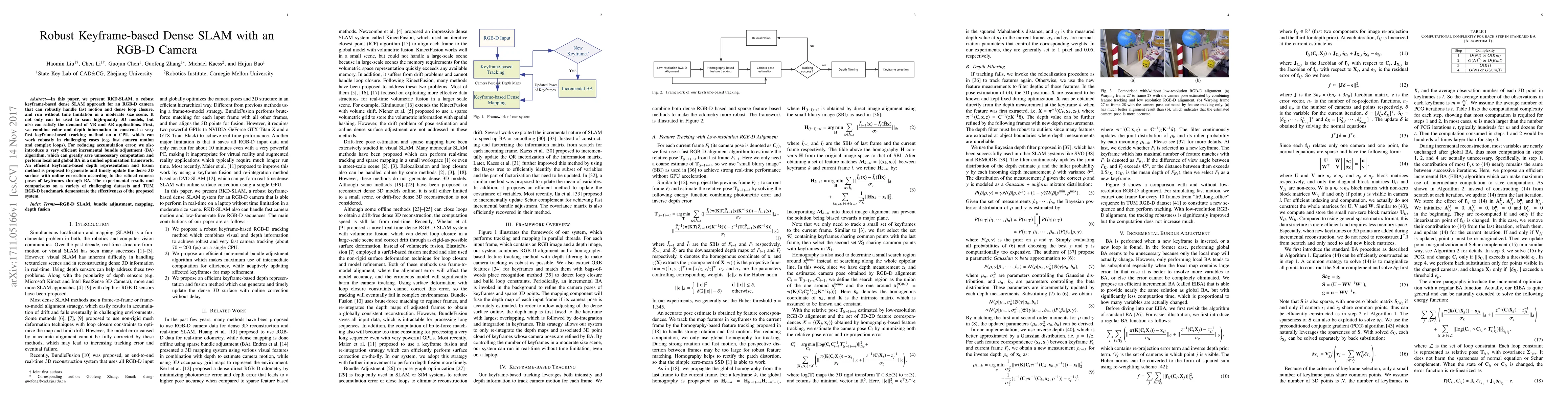 This paper introduces RKD-SLAM, a robust keyframe-based dense SLAM system for RGB-D cameras that efficiently handles fast motion and dense loop closure. It combines color and depth information for fast tracking and uses an incremental bundle adjustment algorithm to minimize accumulation errors and generate high-quality 3D models suitable for VR and AR applications.