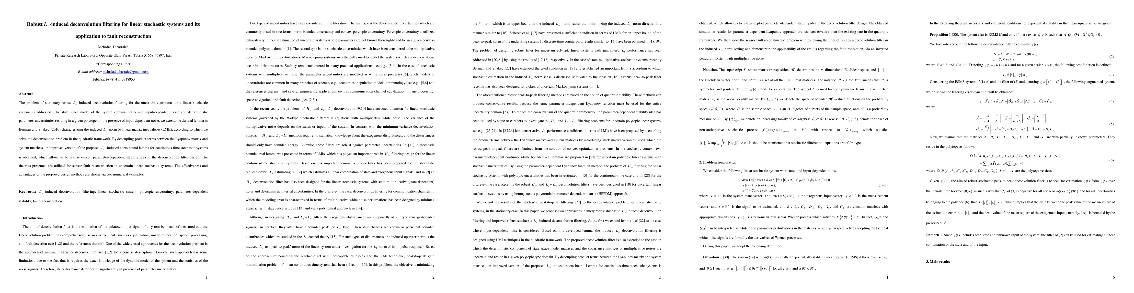 The paper presents an extended lemma for characterizing the induced L_infinity norm using LMIs, an improved L_infinity-induced norm bound lemma for continuous-time stochastic systems, and applies these to sensor fault reconstruction in uncertain linear stochastic systems.