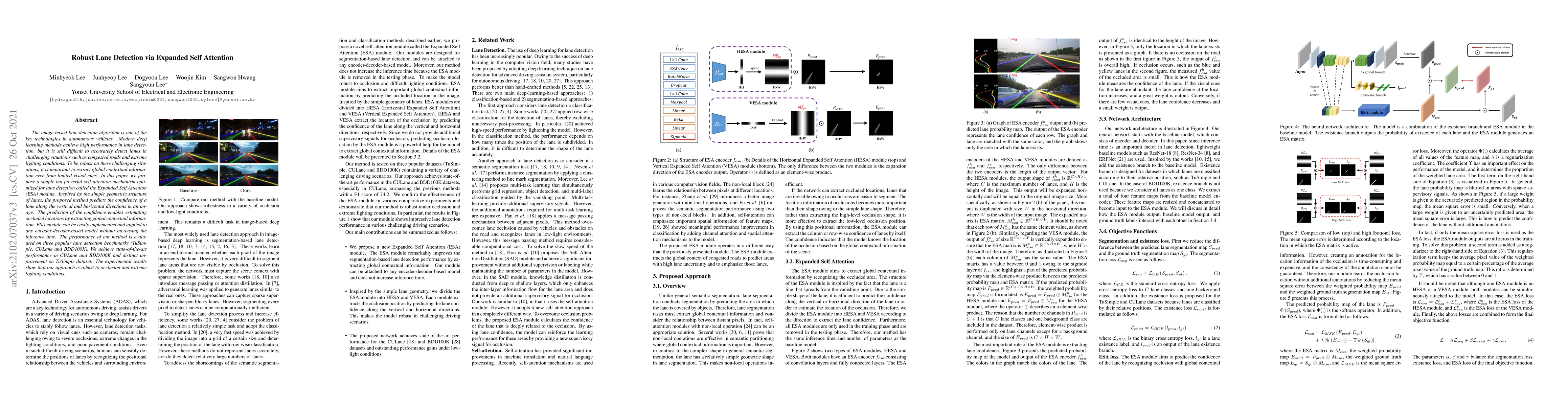This paper proposes an Expanded Self Attention (ESA) module to enhance lane detection in autonomous vehicles, achieving state-of-the-art performance on three benchmarks by leveraging global contextual information to handle occlusions and extreme lighting conditions. The ESA module is simple yet effective, easily integrated into existing encoder-decoder models without increasing inference time.