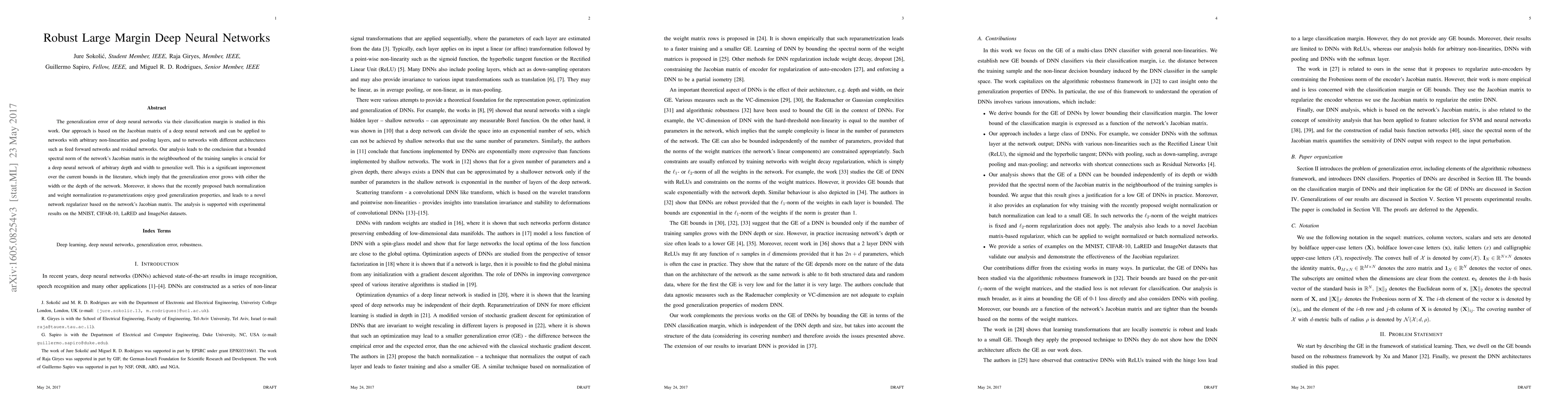 The generalization error of deep neural networks via their classification margin is studied in this work. Our approach is based on the Jacobian matrix of a deep neural network and can be applied to networks with arbitrary non-linearities and pooling layers, and to networks with different architectures such as feed forward networks and residual networks. Our analysis leads to the conclusion that a bounded spectral norm of the network's Jacobian matrix in the neighbourhood of the training samples is crucial for a deep neural network of arbitrary depth and width to generalize well. This is a significant improvement over the current bounds in the literature, which imply that the generalization error grows with either the width or the depth of the network. Moreover, it shows that the recently proposed batch normalization and weight normalization re-parametrizations enjoy good generalization properties, and leads to a novel network regularizer based on the network's Jacobian matrix. The analysis is supported with experimental results on the MNIST, CIFAR-10, LaRED and ImageNet datasets.