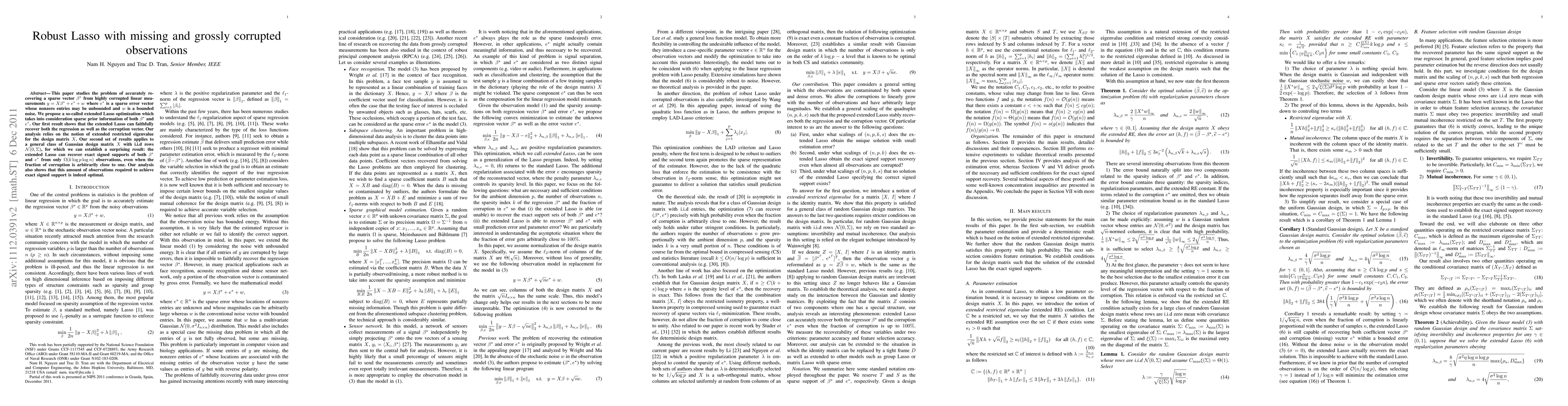 This paper proposes an extended Lasso optimization to recover sparse vectors from highly corrupted linear measurements, demonstrating its ability to accurately identify both the regression and corruption vectors. It establishes optimal observation requirements for exact recovery, even under near-complete corruption.