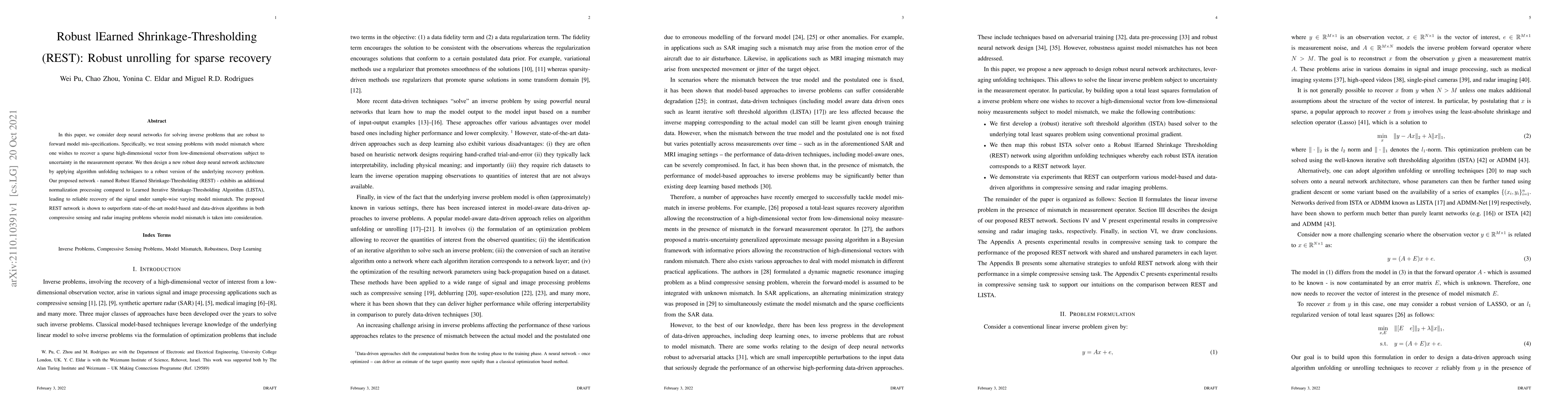 This paper proposes a robust deep neural network called REST for solving inverse problems with model mismatch, outperforming existing algorithms in sparse recovery tasks like compressive sensing and radar imaging. REST incorporates normalization processing to reliably handle sample-wise varying model mismatches.