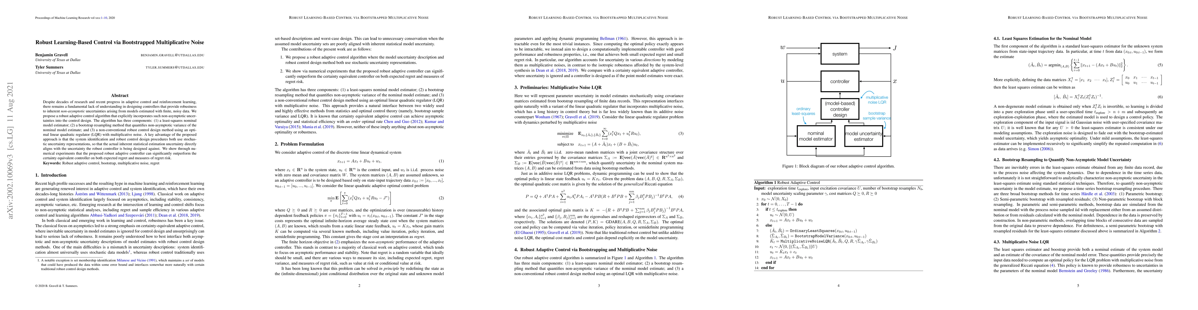 Despite decades of research and recent progress in adaptive control and reinforcement learning, there remains a fundamental lack of understanding in designing controllers that provide robustness to inherent non-asymptotic uncertainties arising from models estimated with finite, noisy data. We propose a robust adaptive control algorithm that explicitly incorporates such non-asymptotic uncertainties into the control design. The algorithm has three components: (1) a least-squares nominal model estimator; (2) a bootstrap resampling method that quantifies non-asymptotic variance of the nominal model estimate; and (3) a non-conventional robust control design method using an optimal linear quadratic regulator (LQR) with multiplicative noise. A key advantage of the proposed approach is that the system identification and robust control design procedures both use stochastic uncertainty representations, so that the actual inherent statistical estimation uncertainty directly aligns with the uncertainty the robust controller is being designed against. We show through numerical experiments that the proposed robust adaptive controller can significantly outperform the certainty equivalent controller on both expected regret and measures of regret risk.