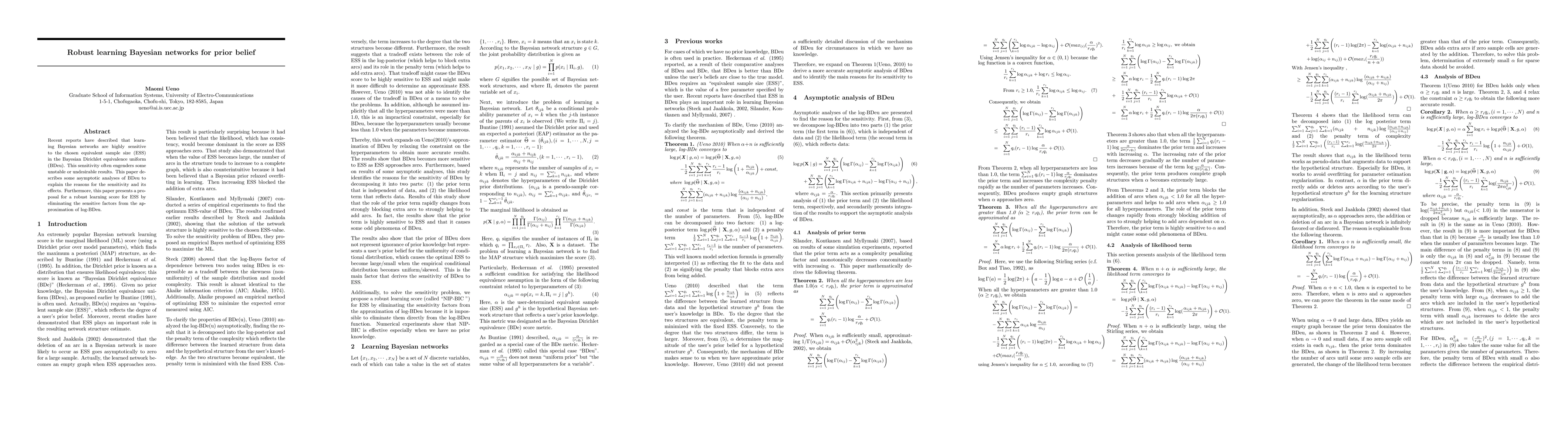 This paper analyzes the sensitivity of Bayesian Dirichlet equivalence uniform (BDeu) to the equivalent sample size (ESS) and proposes a robust learning score to mitigate this issue by eliminating the sensitive factors in the log-BDeu approximation.