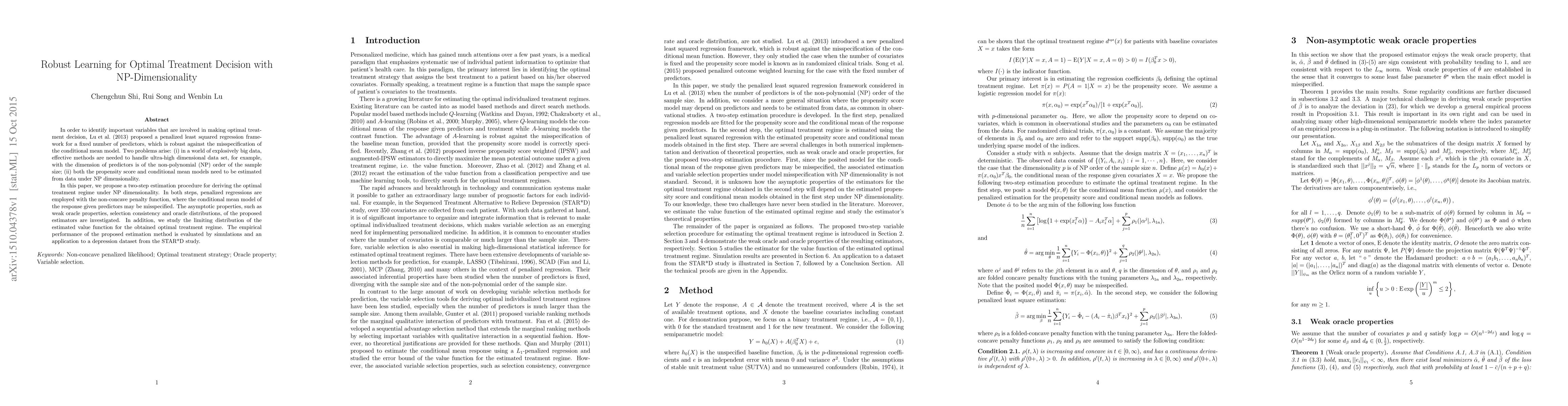 In order to identify important variables that are involved in making optimal treatment decision, Lu et al. (2013) proposed a penalized least squared regression framework for a fixed number of predictors, which is robust against the misspecification of the conditional mean model. Two problems arise: (i) in a world of explosively big data, effective methods are needed to handle ultra-high dimensional data set, for example, with the dimension of predictors is of the non-polynomial (NP) order of the sample size; (ii) both the propensity score and conditional mean models need to be estimated from data under NP dimensionality. In this paper, we propose a two-step estimation procedure for deriving the optimal treatment regime under NP dimensionality. In both steps, penalized regressions are employed with the non-concave penalty function, where the conditional mean model of the response given predictors may be misspecified. The asymptotic properties, such as weak oracle properties, selection consistency and oracle distributions, of the proposed estimators are investigated. In addition, we study the limiting distribution of the estimated value function for the obtained optimal treatment regime. The empirical performance of the proposed estimation method is evaluated by simulations and an application to a depression dataset from the STAR*D study.