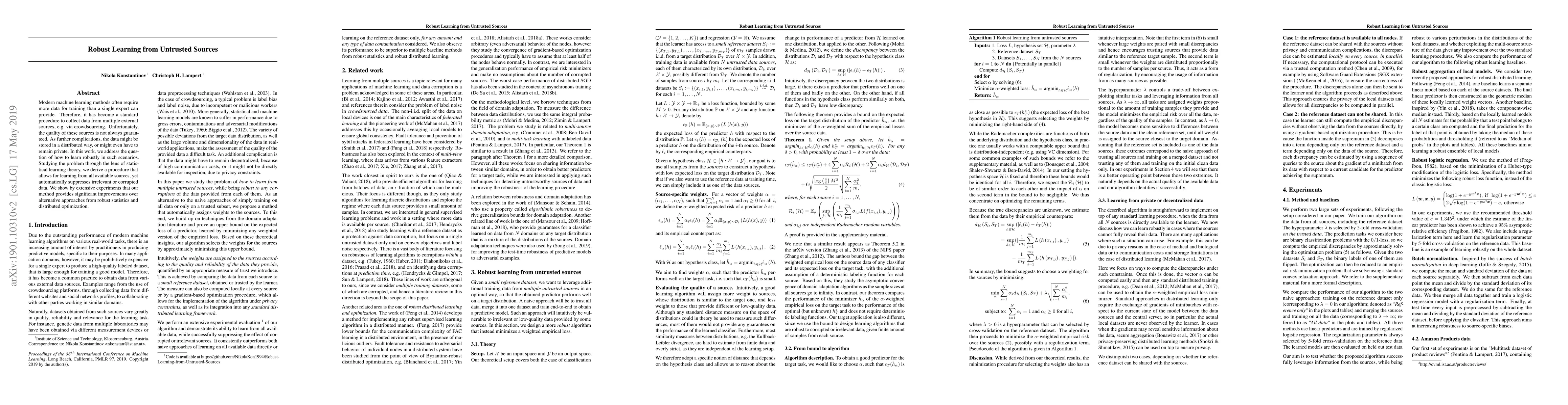 Modern machine learning methods often require more data for training than a single expert can provide. Therefore, it has become a standard procedure to collect data from external sources, e.g. via crowdsourcing. Unfortunately, the quality of these sources is not always guaranteed. As additional complications, the data might be stored in a distributed way, or might even have to remain private. In this work, we address the question of how to learn robustly in such scenarios. Studying the problem through the lens of statistical learning theory, we derive a procedure that allows for learning from all available sources, yet automatically suppresses irrelevant or corrupted data. We show by extensive experiments that our method provides significant improvements over alternative approaches from robust statistics and distributed optimization.