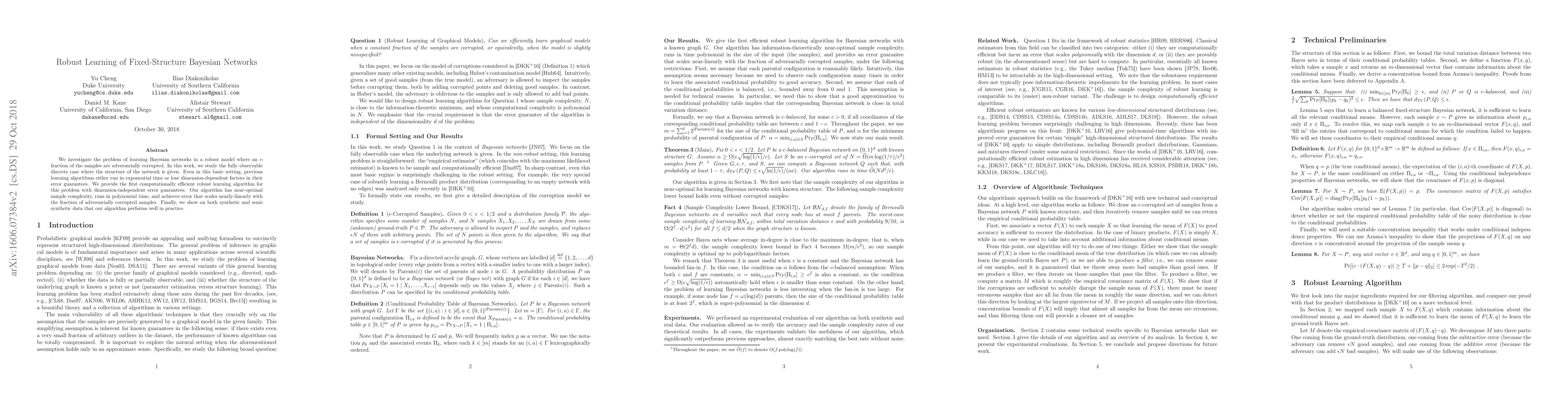 This paper presents a computationally efficient algorithm for robust learning of fixed-structure Bayesian networks under adversarial corruption, achieving dimension-independent error guarantees and near-optimal sample complexity while running in polynomial time. Empirical results on synthetic and semi-synthetic data demonstrate its practical effectiveness.