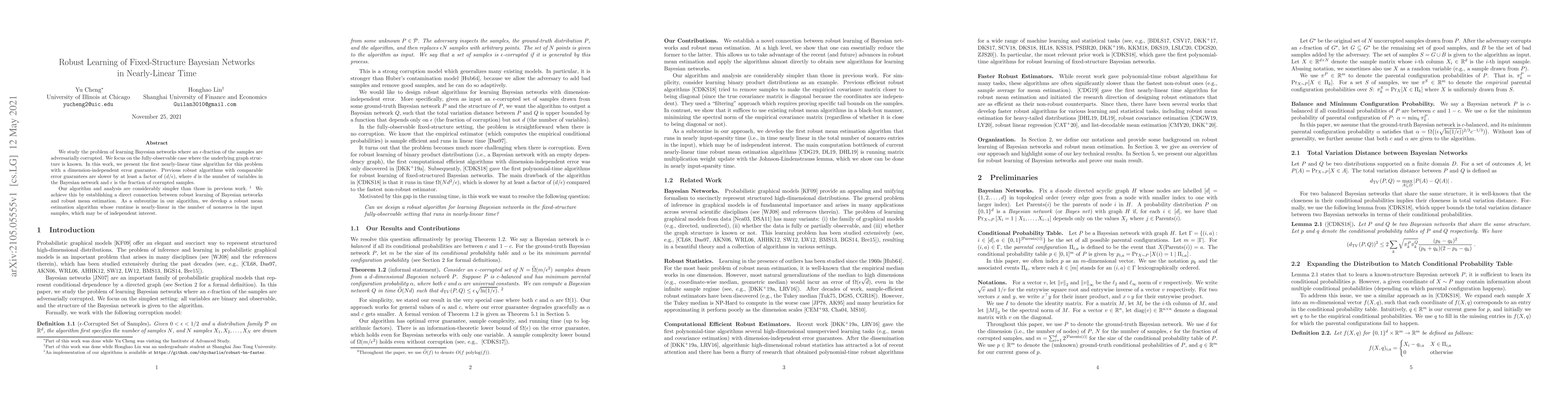 Summary: This paper introduces a nearly-linear time algorithm for learning Bayesian networks with fixed structure, even when a fraction of samples are adversarially corrupted. The method simplifies previous robust algorithms and connects robust Bayesian network learning to robust mean estimation, achieving a dimension-independent error guarantee.
