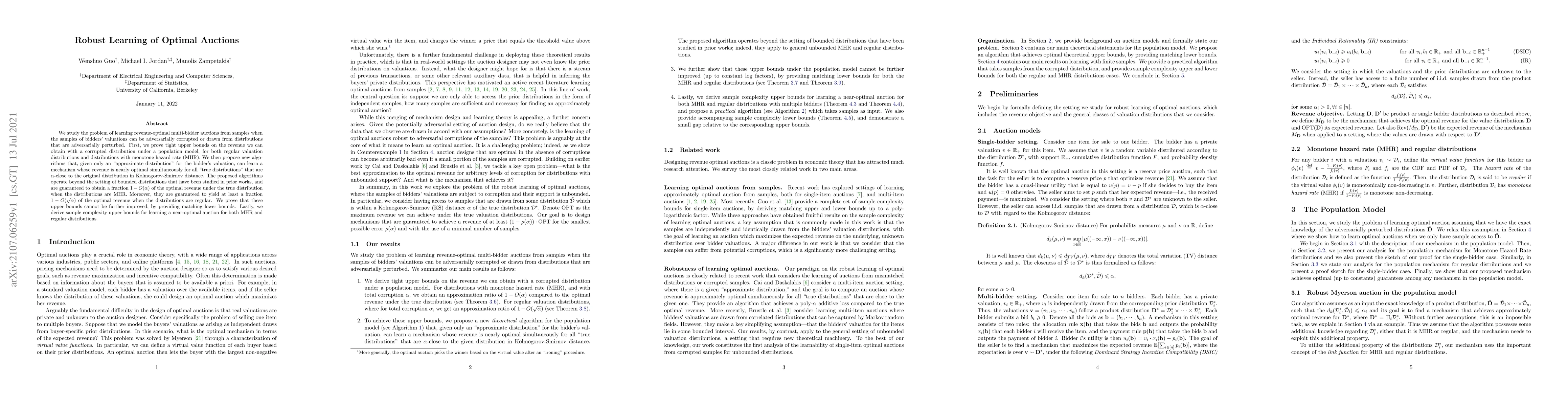 We study the problem of learning revenue-optimal multi-bidder auctions from samples when the samples of bidders' valuations can be adversarially corrupted or drawn from distributions that are adversarially perturbed. First, we prove tight upper bounds on the revenue we can obtain with a corrupted distribution under a population model, for both regular valuation distributions and distributions with monotone hazard rate (MHR). We then propose new algorithms that, given only an ``approximate distribution'' for the bidder's valuation, can learn a mechanism whose revenue is nearly optimal simultaneously for all ``true distributions'' that are $\alpha$-close to the original distribution in Kolmogorov-Smirnov distance. The proposed algorithms operate beyond the setting of bounded distributions that have been studied in prior works, and are guaranteed to obtain a fraction $1-O(\alpha)$ of the optimal revenue under the true distribution when the distributions are MHR. Moreover, they are guaranteed to yield at least a fraction $1-O(\sqrt{\alpha})$ of the optimal revenue when the distributions are regular. We prove that these upper bounds cannot be further improved, by providing matching lower bounds. Lastly, we derive sample complexity upper bounds for learning a near-optimal auction for both MHR and regular distributions.