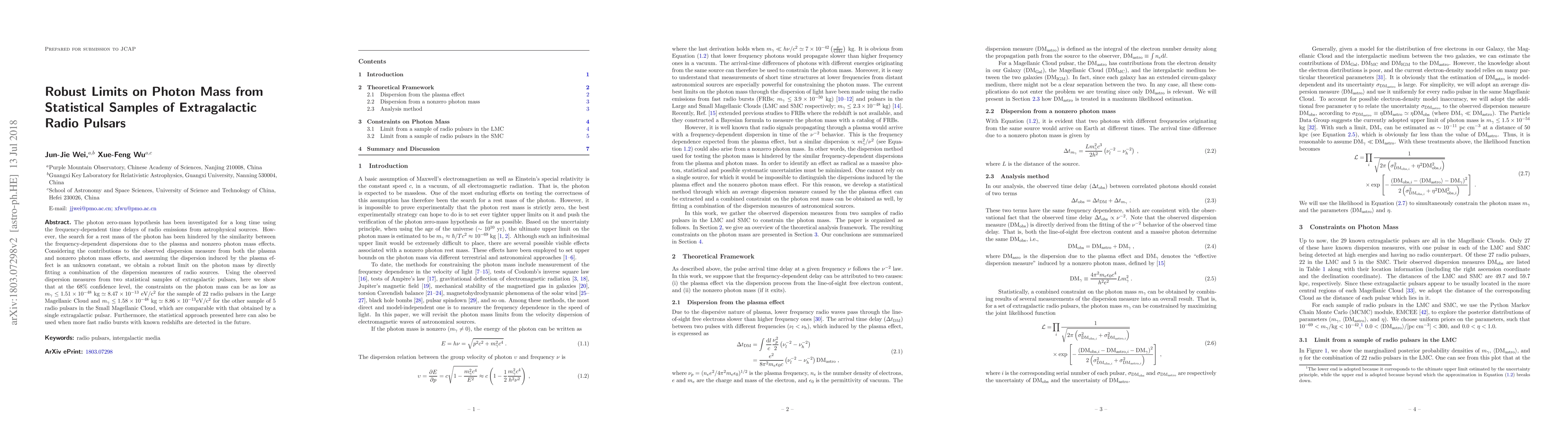 The photon zero-mass hypothesis has been investigated for a long time using the frequency-dependent time delays of radio emissions from astrophysical sources. However, the search for a rest mass of the photon has been hindered by the similarity between the frequency-dependent dispersions due to the plasma and nonzero photon mass effects. Considering the contributions to the observed dispersion measure from both the plasma and nonzero photon mass effects, and assuming the dispersion induced by the plasma effect is an unknown constant, we obtain a robust limit on the photon mass by directly fitting a combination of the dispersion measures of radio sources. Using the observed dispersion measures from two statistical samples of extragalactic pulsars, here we show that at the 68\% confidence level, the constraints on the photon mass can be as low as $m_{\gamma}\leq1.51\times10^{-48}~\rm kg\simeq8.47\times10^{-13}~{\rm eV}/c^{2}$ for the sample of 22 radio pulsars in the Large Magellanic Cloud and $m_{\gamma}\leq1.58\times10^{-48}~\rm kg\simeq8.86\times10^{-13} {\rm eV}/c^{2}$ for the other sample of 5 radio pulsars in the Small Magellanic Cloud, which are comparable with that obtained by a single extragalactic pulsar. Furthermore, the statistical approach presented here can also be used when more fast radio bursts with known redshifts are detected in the future.