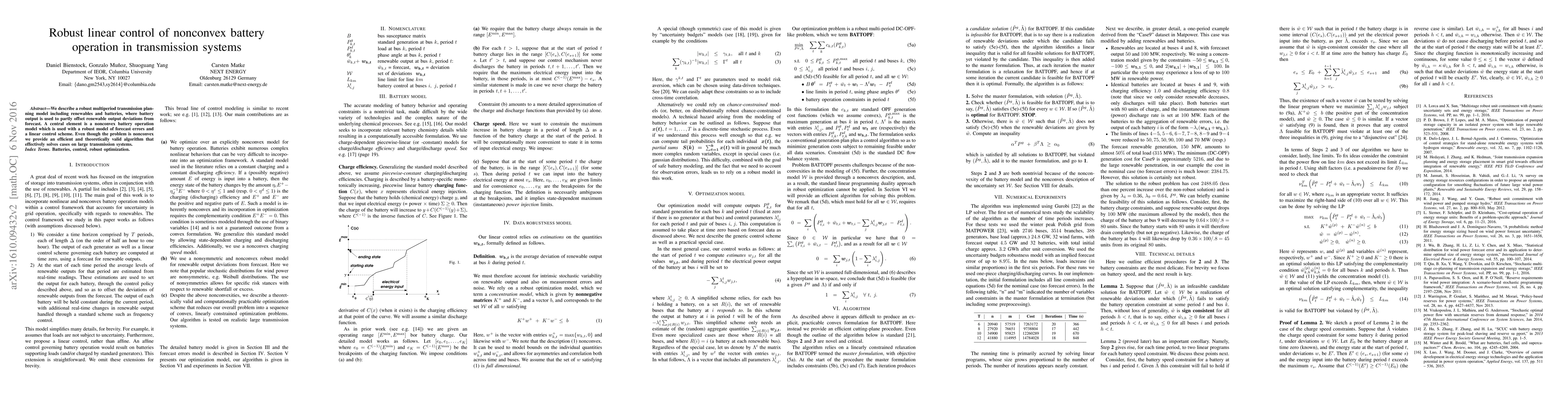 We describe a robust multiperiod transmission plan- ning model including renewables and batteries, where battery output is used to partly offset renewable output deviations from forecast. A central element is a nonconvex battery operation model which is used with a robust model of forecast errors and a linear control scheme. Even though the problem is nonconvex we provide an efficient and theoretically valid algorithm that effectively solves cases on large transmission systems. Index Terms. Batteries, control, robust optimization.