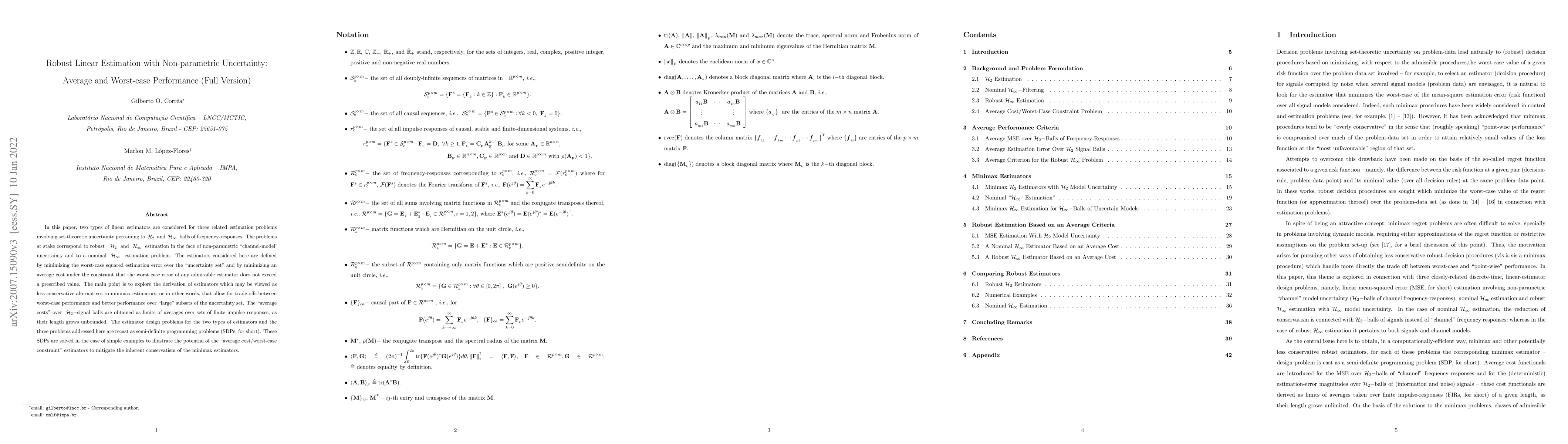 In this paper, two types of linear estimators are considered for three related estimation problems involving set-theoretic uncertainty pertaining to $\mathcal{H}_{2}$ and $\mathcal{H}_{\infty}$ balls of frequency-responses. The problems at stake correspond to robust $\mathcal{H}_{2}$ and $\mathcal{H}_{\infty}$ in the face of non-parametric "channel-model" uncertainty and to a nominal $\mathcal{H}_{\infty}$ estimation problem. The estimators considered here are defined by minimizing the worst-case squared estimation error over the "uncertainty set" and by minimizing an average cost under the constraint that the worst-case error of any admissible estimator does not exceed a prescribed value. The main point is to explore the derivation of estimators which may be viewed as less conservative alternatives to minimax estimators, or in other words, that allow for trade-offs between worst-case performance and better performance over "large" subsets of the uncertainty set. The "average costs" over $\mathcal{H}_{2}-$signal balls are obtained as limits of averages over sets of finite impulse responses, as their length grows unbounded. The estimator design problems for the two types of estimators and the three problems addressed here are recast as semi-definite programming problems (SDPs, for short). These SDPs are solved in the case of simple examples to illustrate the potential of the "average cost/worst-case constraint" estimators to mitigate the inherent conservatism of the minimax estimators.