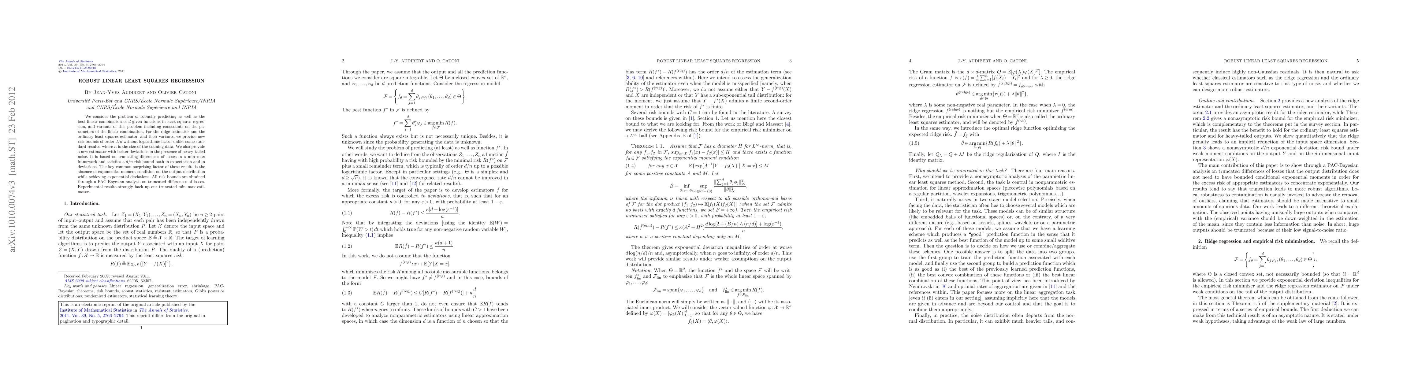 We consider the problem of robustly predicting as well as the best linear combination of $d$ given functions in least squares regression, and variants of this problem including constraints on the parameters of the linear combination. For the ridge estimator and the ordinary least squares estimator, and their variants, we provide new risk bounds of order $d/n$ without logarithmic factor unlike some standard results, where $n$ is the size of the training data. We also provide a new estimator with better deviations in the presence of heavy-tailed noise. It is based on truncating differences of losses in a min--max framework and satisfies a $d/n$ risk bound both in expectation and in deviations. The key common surprising factor of these results is the absence of exponential moment condition on the output distribution while achieving exponential deviations. All risk bounds are obtained through a PAC-Bayesian analysis on truncated differences of losses. Experimental results strongly back up our truncated min--max estimator.