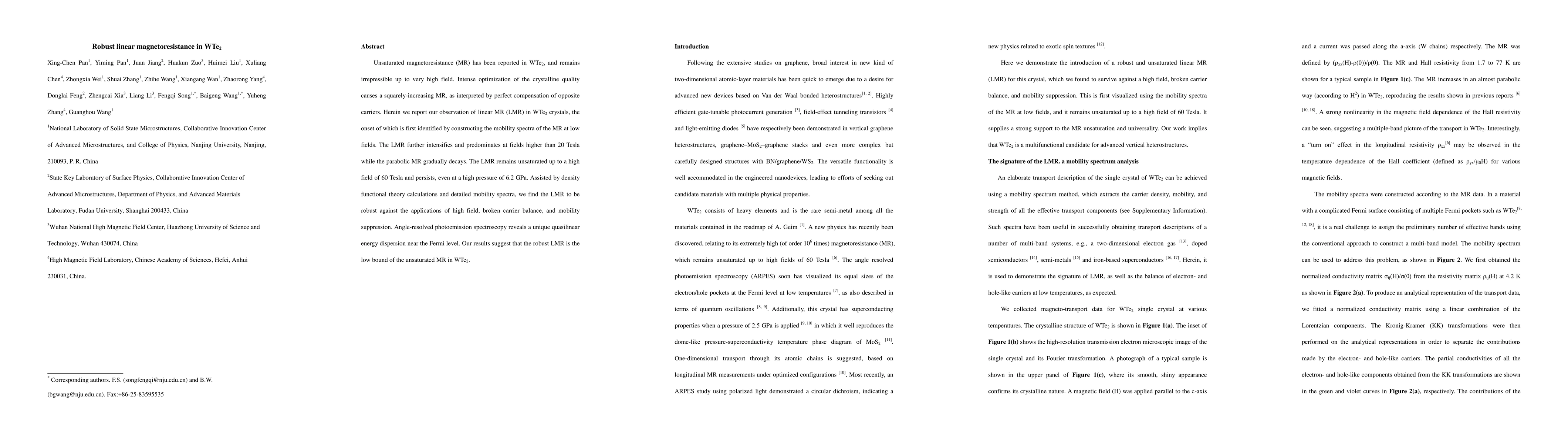 This paper reports the observation of robust linear magnetoresistance (LMR) in WTe2, which remains strong even at high magnetic fields and pressures, suggesting it is the lower limit of the material's unsaturated magnetoresistance. The LMR is attributed to a unique quasilinear energy dispersion near the Fermi level, confirmed by density functional theory and angle-resolved photoemission spectroscopy.