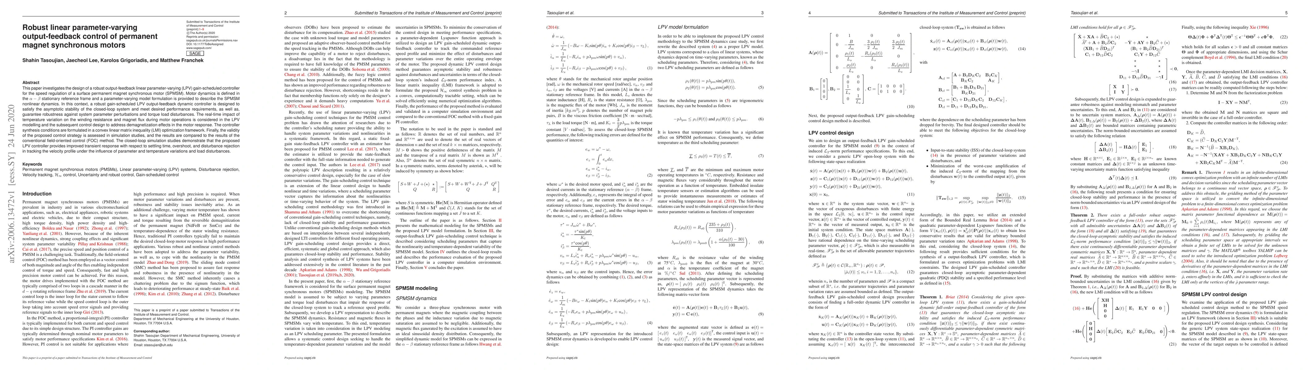 This paper develops a robust output-feedback LPV controller for surface permanent magnet synchronous motors, ensuring stability and performance under parameter and load variations, with simulations showing superior transient response compared to conventional control methods. The design utilizes convex LMI optimization for controller synthesis.