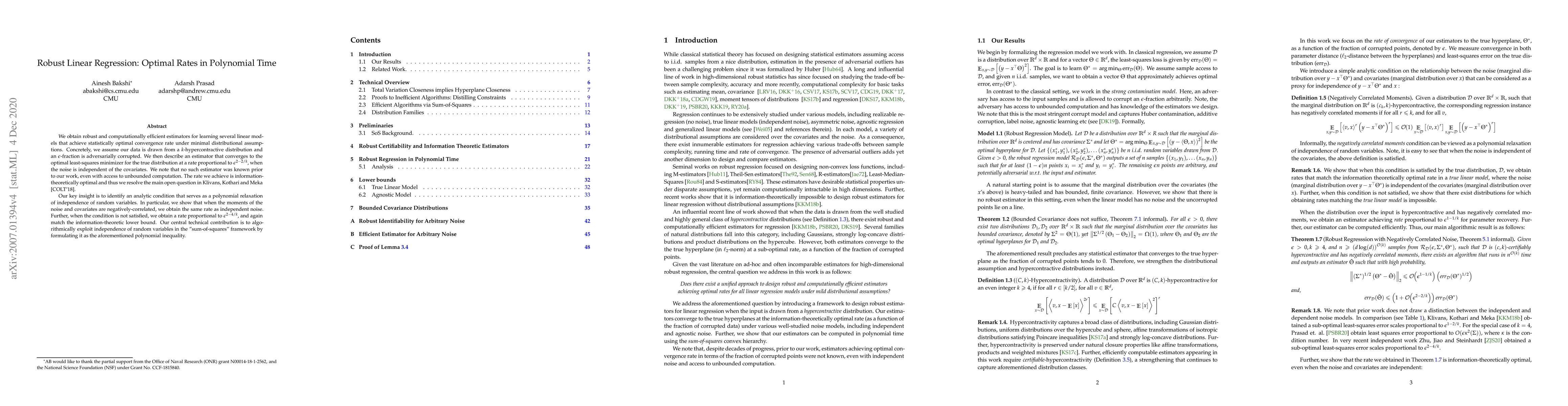 We obtain robust and computationally efficient estimators for learning several linear models that achieve statistically optimal convergence rate under minimal distributional assumptions. Concretely, we assume our data is drawn from a $k$-hypercontractive distribution and an $\epsilon$-fraction is adversarially corrupted. We then describe an estimator that converges to the optimal least-squares minimizer for the true distribution at a rate proportional to $\epsilon^{2-2/k}$, when the noise is independent of the covariates. We note that no such estimator was known prior to our work, even with access to unbounded computation. The rate we achieve is information-theoretically optimal and thus we resolve the main open question in Klivans, Kothari and Meka [COLT'18]. Our key insight is to identify an analytic condition that serves as a polynomial relaxation of independence of random variables. In particular, we show that when the moments of the noise and covariates are negatively-correlated, we obtain the same rate as independent noise. Further, when the condition is not satisfied, we obtain a rate proportional to $\epsilon^{2-4/k}$, and again match the information-theoretic lower bound. Our central technical contribution is to algorithmically exploit independence of random variables in the "sum-of-squares" framework by formulating it as the aforementioned polynomial inequality.